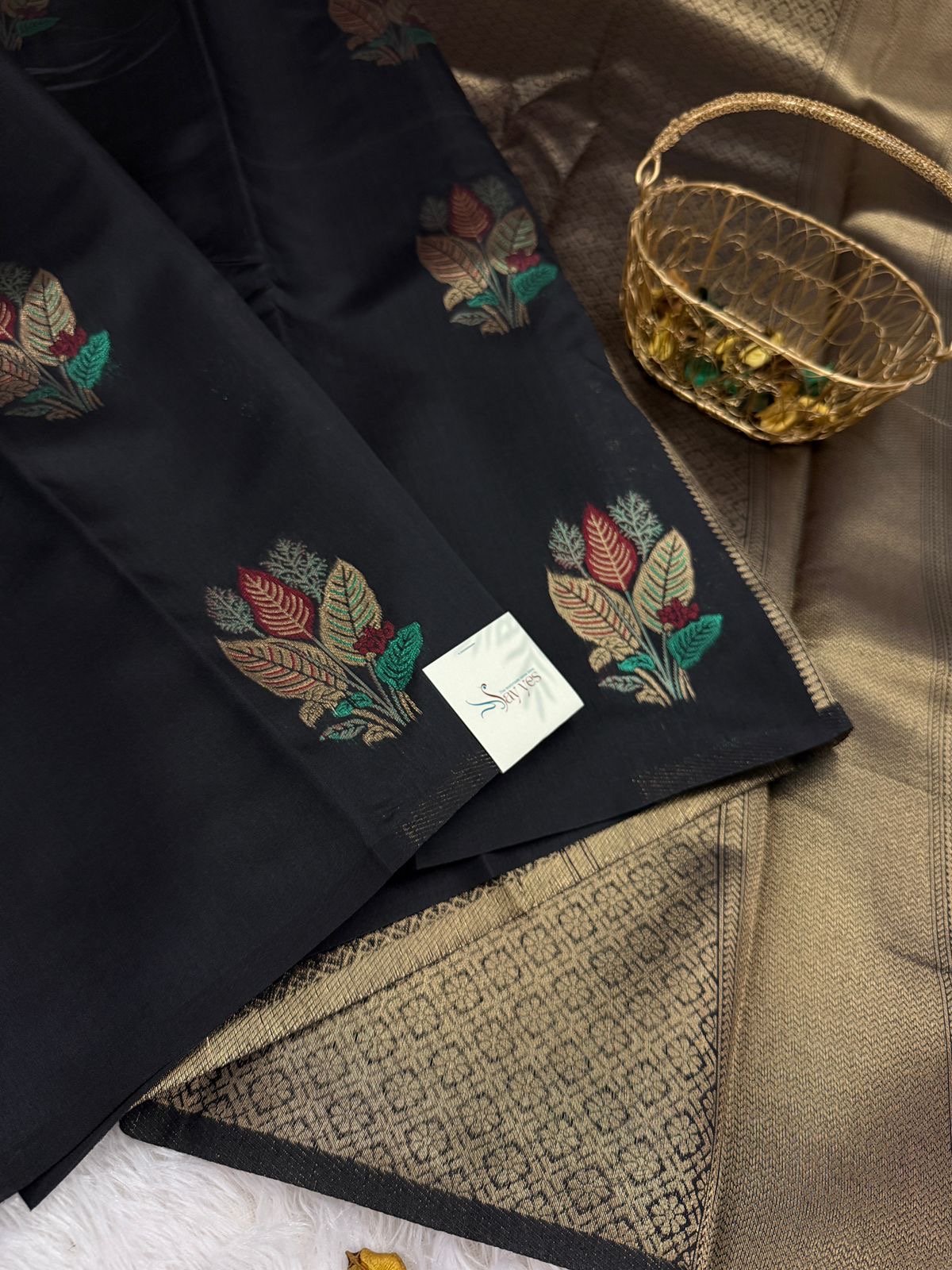 A semi soft silk saree in an elegant black base, adorned with 3D embossed multicolour leaf motifs that create a tactile and visual richness. The zari border and pallu are woven in intricate geometric and traditional patterns with antique gold finish, offering a perfect blend of heritage craftsmanship and modern finesse. Lightweight, lustrous, and festive-ready, this saree drapes gracefully and brings statement sophistication to any occasion.