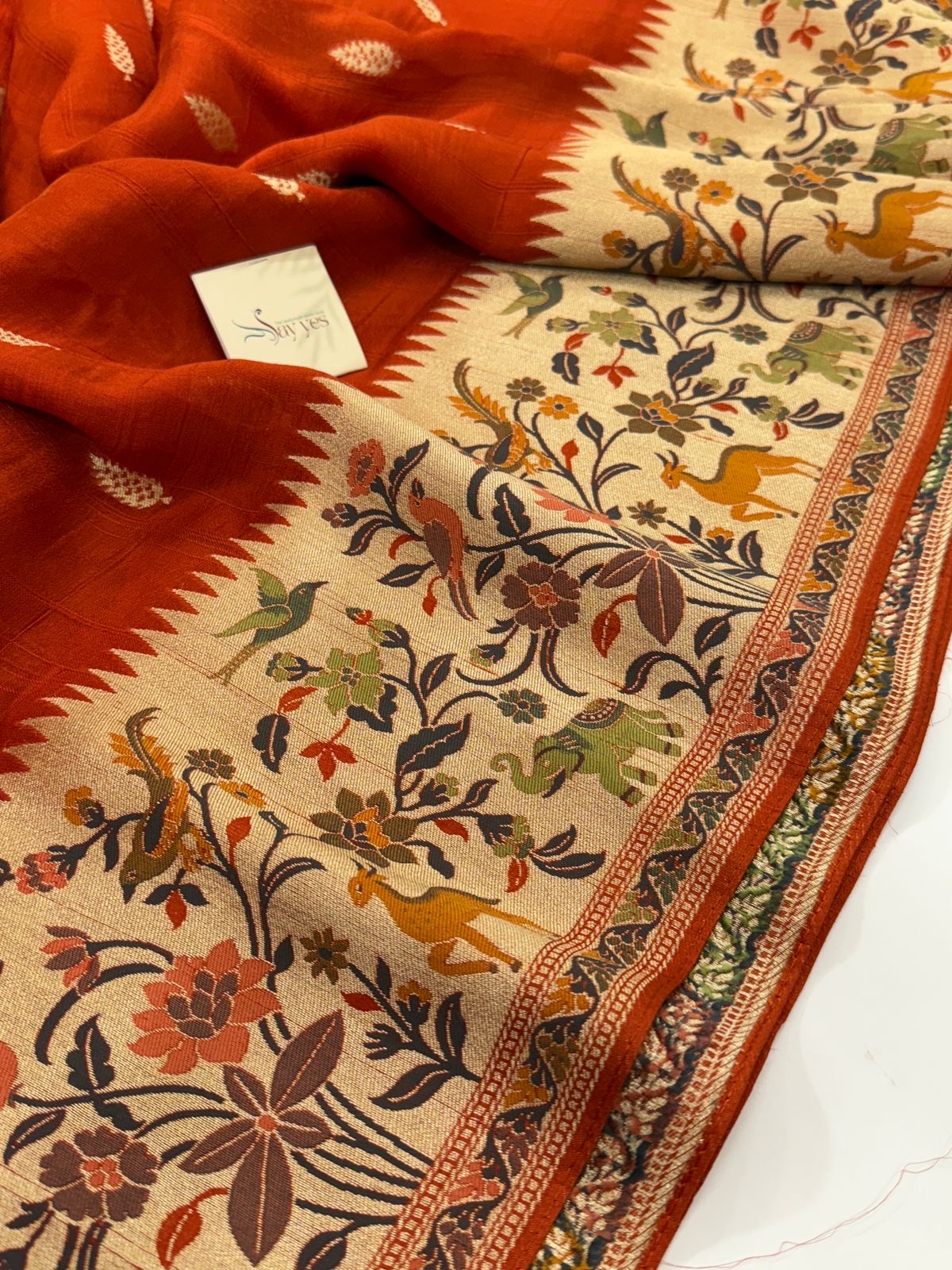 - Speciality: Luxurious zari weave with vibrant floral accents