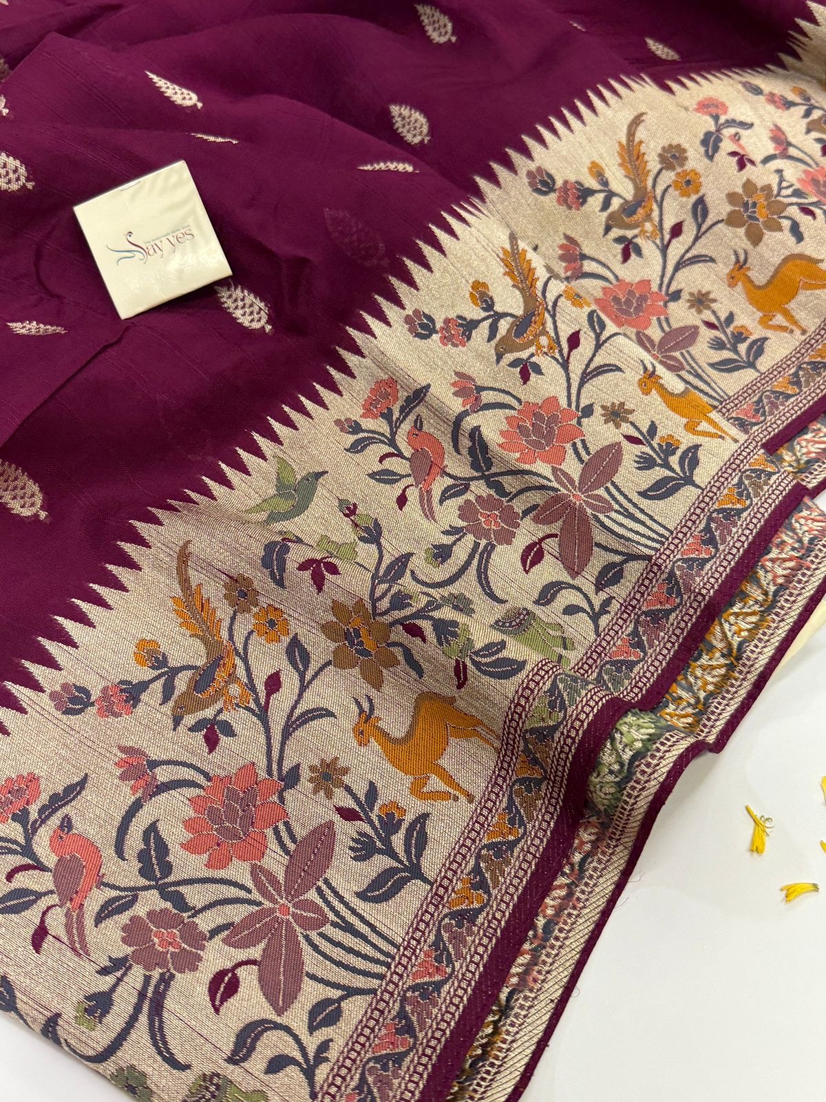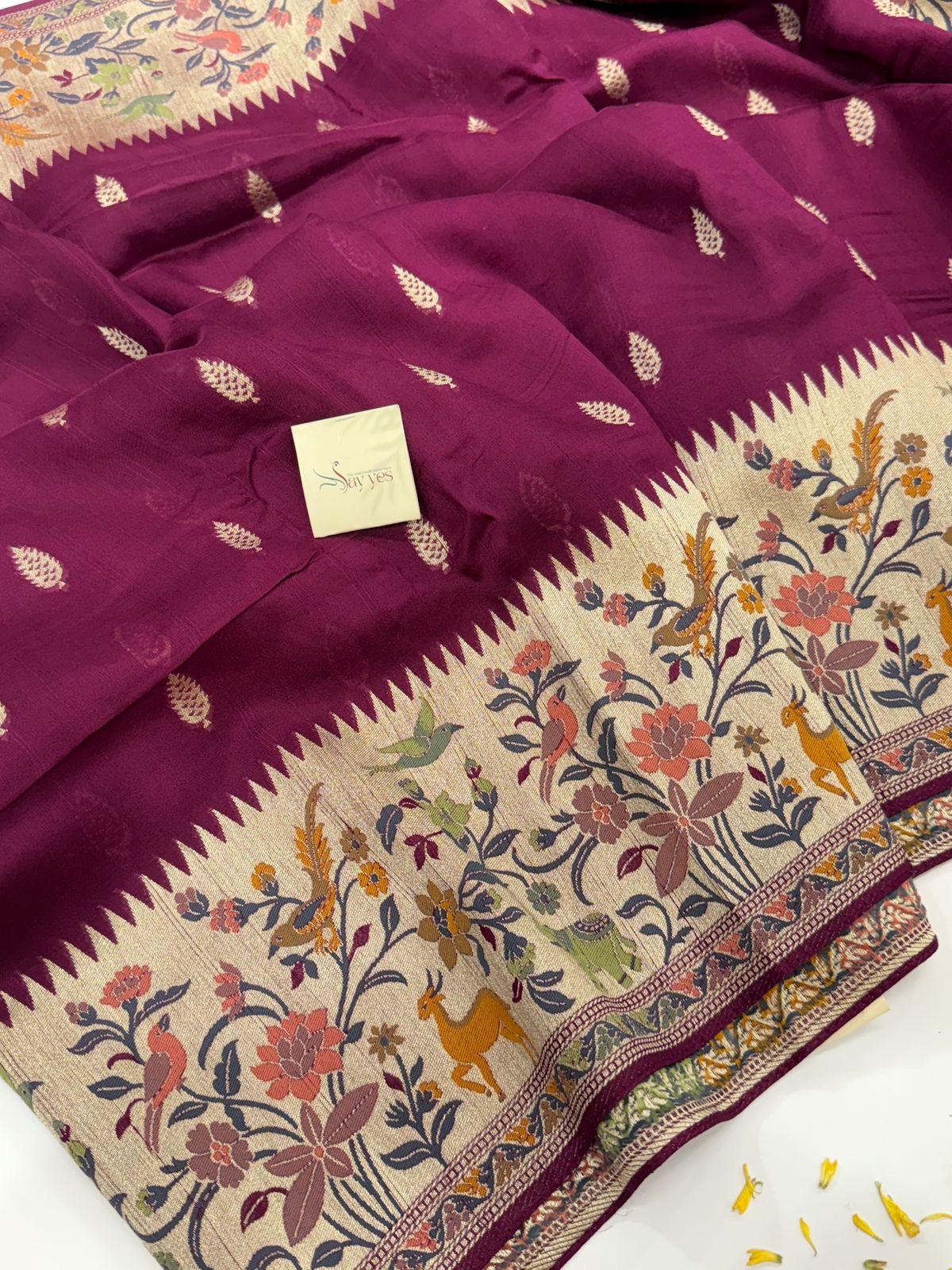 - Speciality: Luxurious zari weave with vibrant floral accents