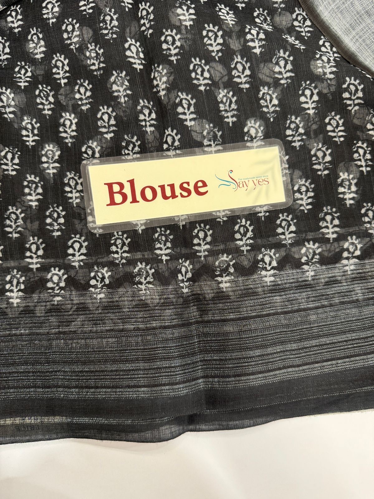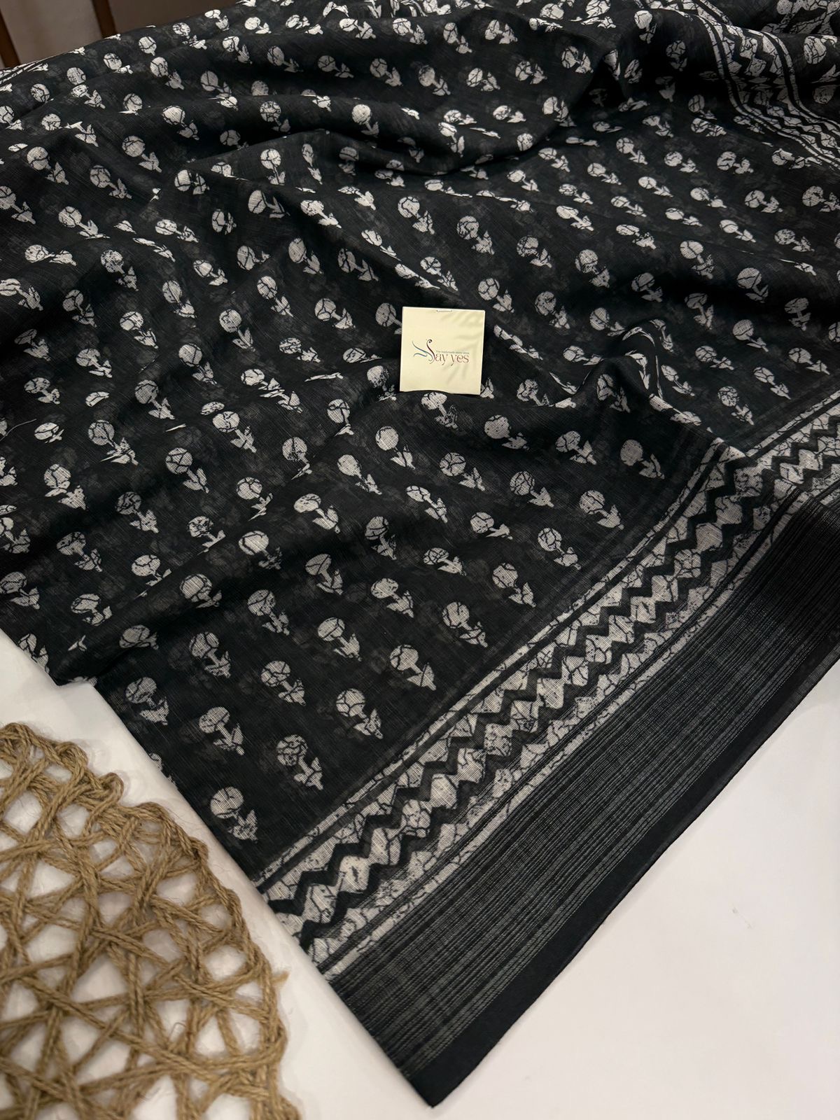 An elegant black and white hand-block printed cotton saree, showcasing the timeless artistry of traditional block printing. The body features evenly spaced floral motifs in white, contrasted beautifully against the deep black base. The border is adorned with intricate geometric and floral block prints, adding depth and visual interest. The pallu carries a rich blend of detailed motifs and fine stripes, creating a sophisticated, artisanal finish. Crafted from lightweight cotton, this saree ensures a breathable, comfortable drape — perfect for casual elegance or a chic ethnic statement.