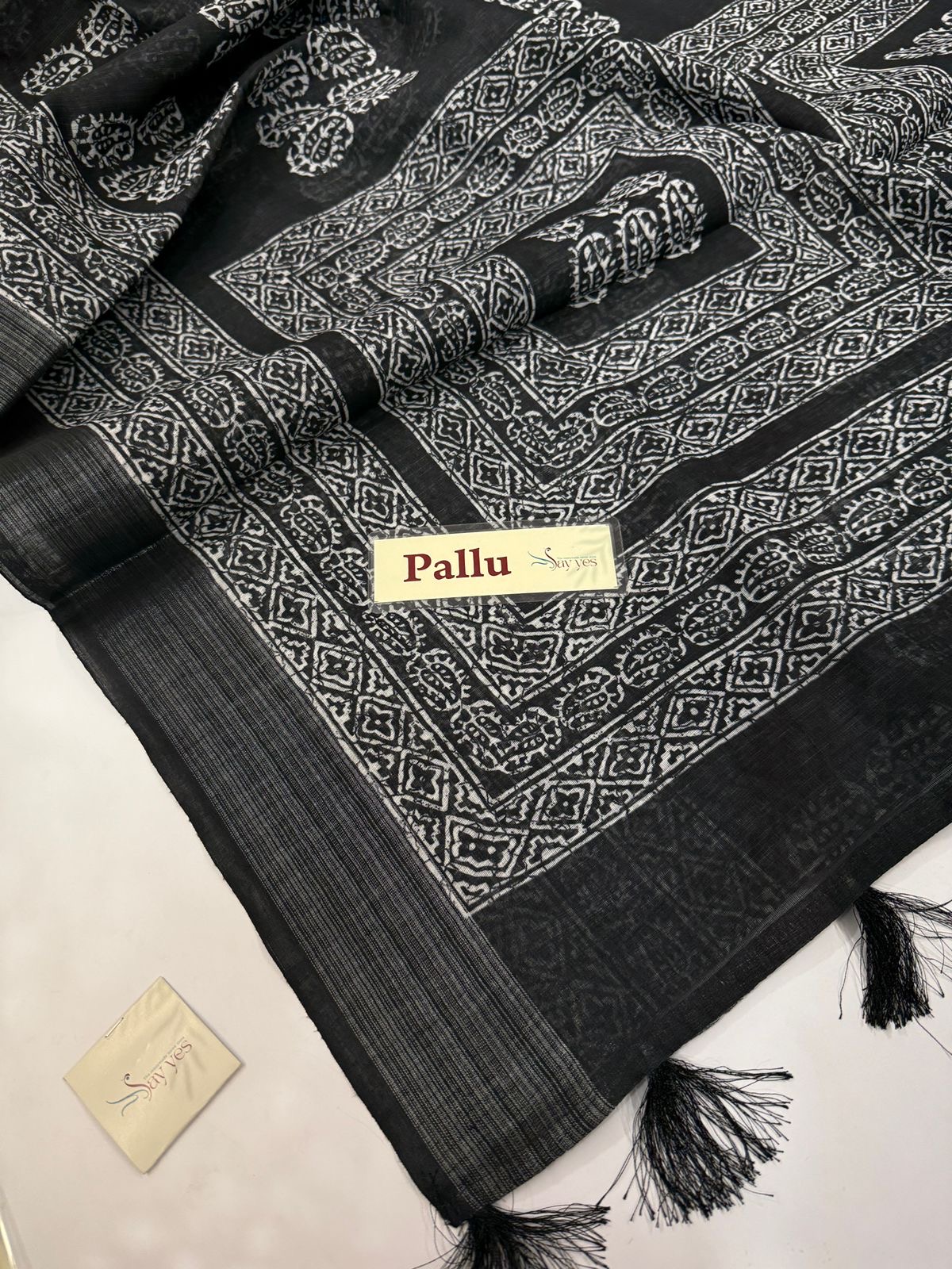 - Pallu: Coordinated block print with fine stripe detailing
