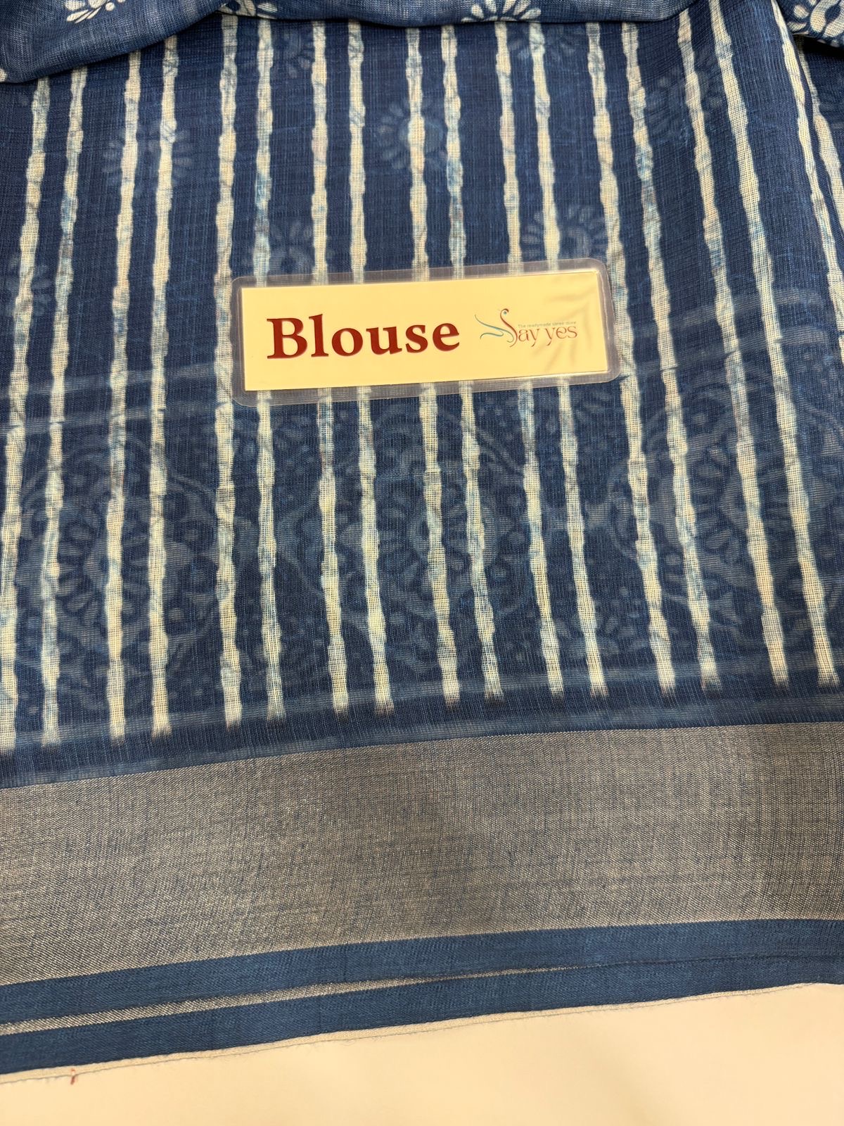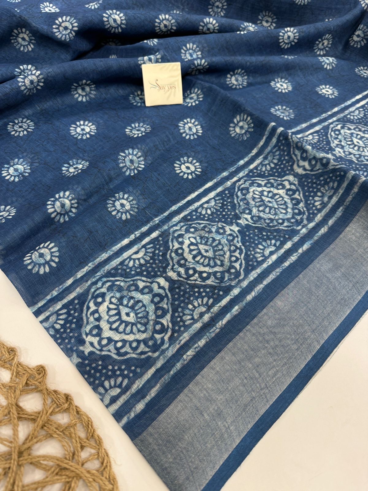 An elegant Indigo and white hand-block printed cotton saree, showcasing the timeless artistry of traditional block printing. The body features evenly spaced floral motifs in white, contrasted beautifully against the deep Indigo base. The border is adorned with intricate geometric and floral block prints, adding depth and visual interest. The pallu carries a rich blend of detailed motifs and fine stripes, creating a sophisticated, artisanal finish. Crafted from lightweight cotton, this saree ensures a breathable, comfortable drape — perfect for casual elegance or a chic ethnic statement.