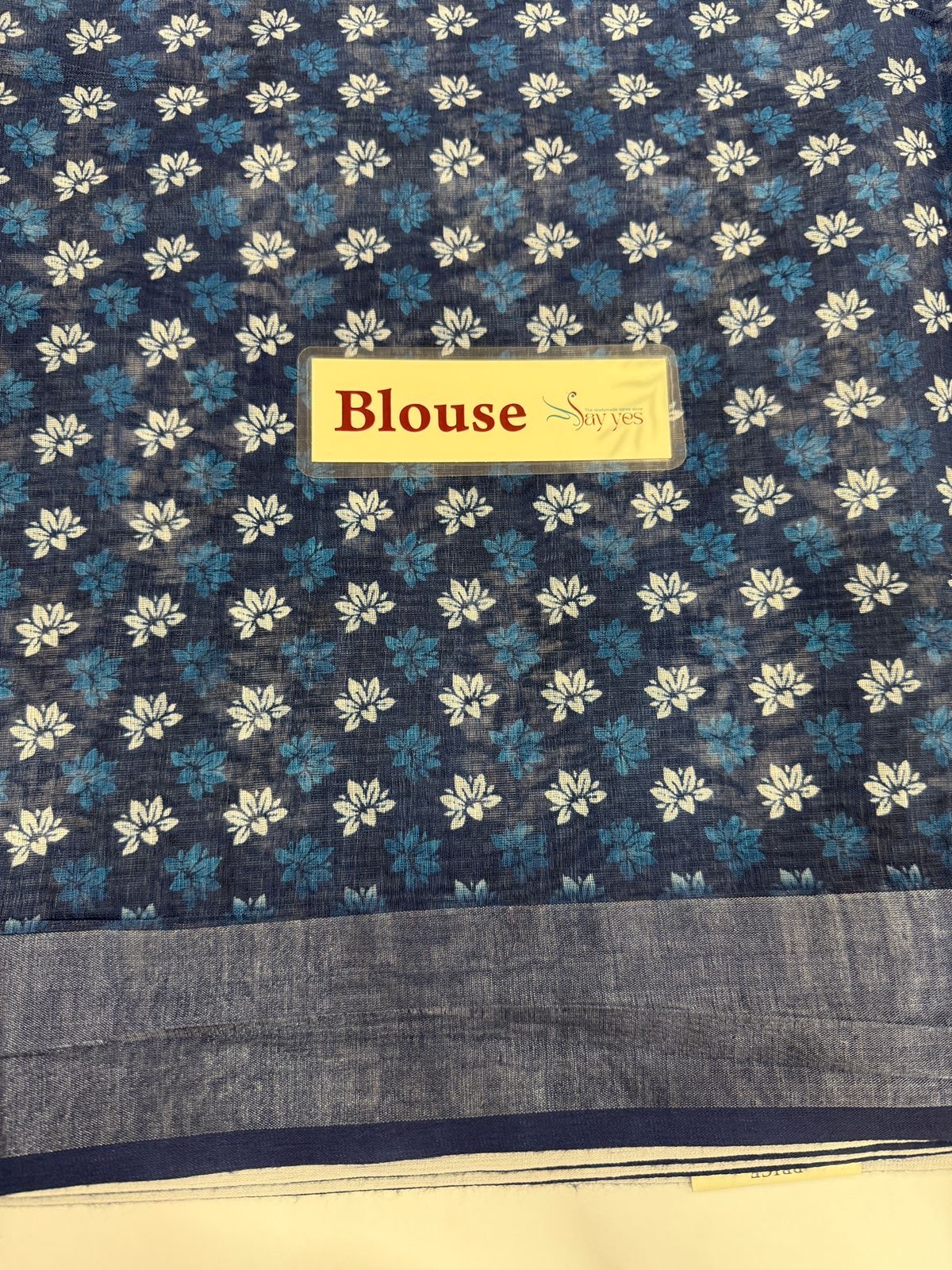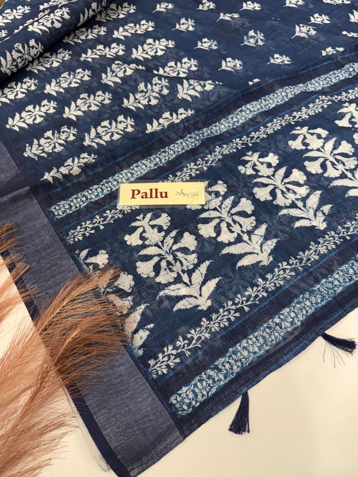 An elegant Indigo and white hand-block printed cotton saree, showcasing the timeless artistry of traditional block printing. The body features evenly spaced floral motifs in white, contrasted beautifully against the deep Indigo base. The border is adorned with intricate geometric and floral block prints, adding depth and visual interest. The pallu carries a rich blend of detailed motifs and fine stripes, creating a sophisticated, artisanal finish. Crafted from lightweight cotton, this saree ensures a breathable, comfortable drape — perfect for casual elegance or a chic ethnic statement.