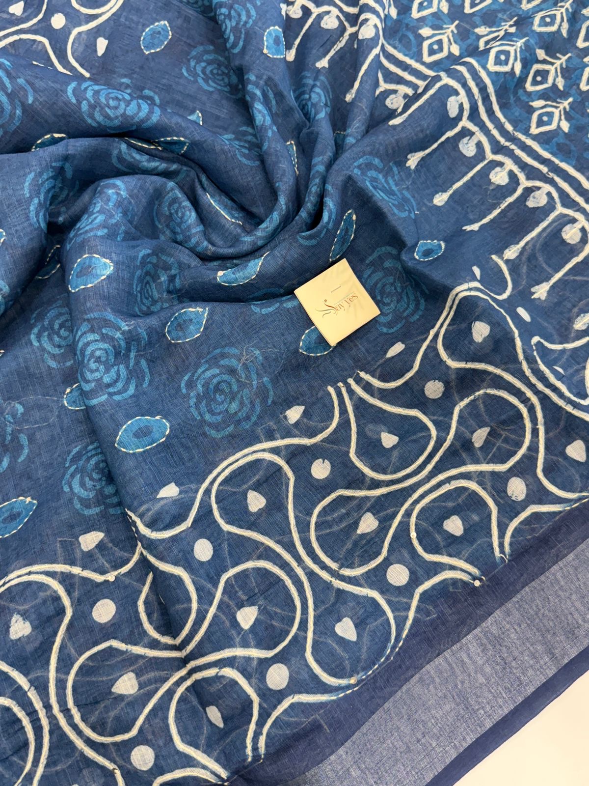 An elegant Indigo and white hand-block printed cotton saree, showcasing the timeless artistry of traditional block printing. The body features evenly spaced floral motifs in white, contrasted beautifully against the deep Indigo base. The border is adorned with intricate geometric and floral block prints, adding depth and visual interest. The pallu carries a rich blend of detailed motifs and fine stripes, creating a sophisticated, artisanal finish. Crafted from lightweight cotton, this saree ensures a breathable, comfortable drape — perfect for casual elegance or a chic ethnic statement.