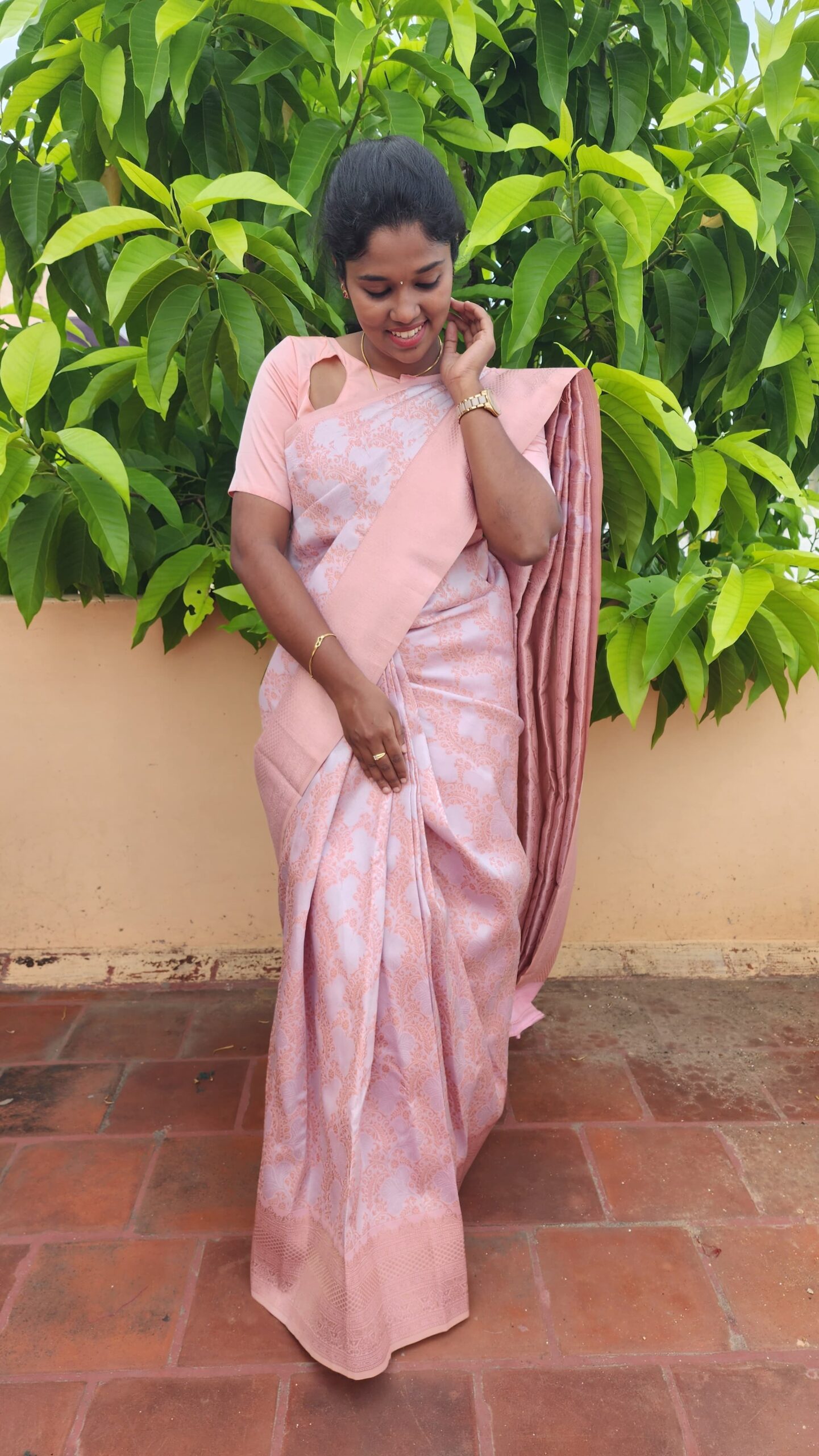 This elegant saree features a rich copper tone with intricate floral motifs woven across the body, accentuated by a delicate interplay of silver threads. The luxurious banarasi weave brings out the timeless beauty of traditional craftsmanship, with a heavy border adorned in detailed patterns that enhance its grandeur. The saree’s lustrous finish and sophisticated design make it perfect for festive occasions or weddings, adding a regal touch to your wardrobe.