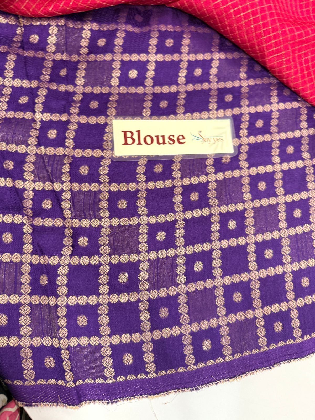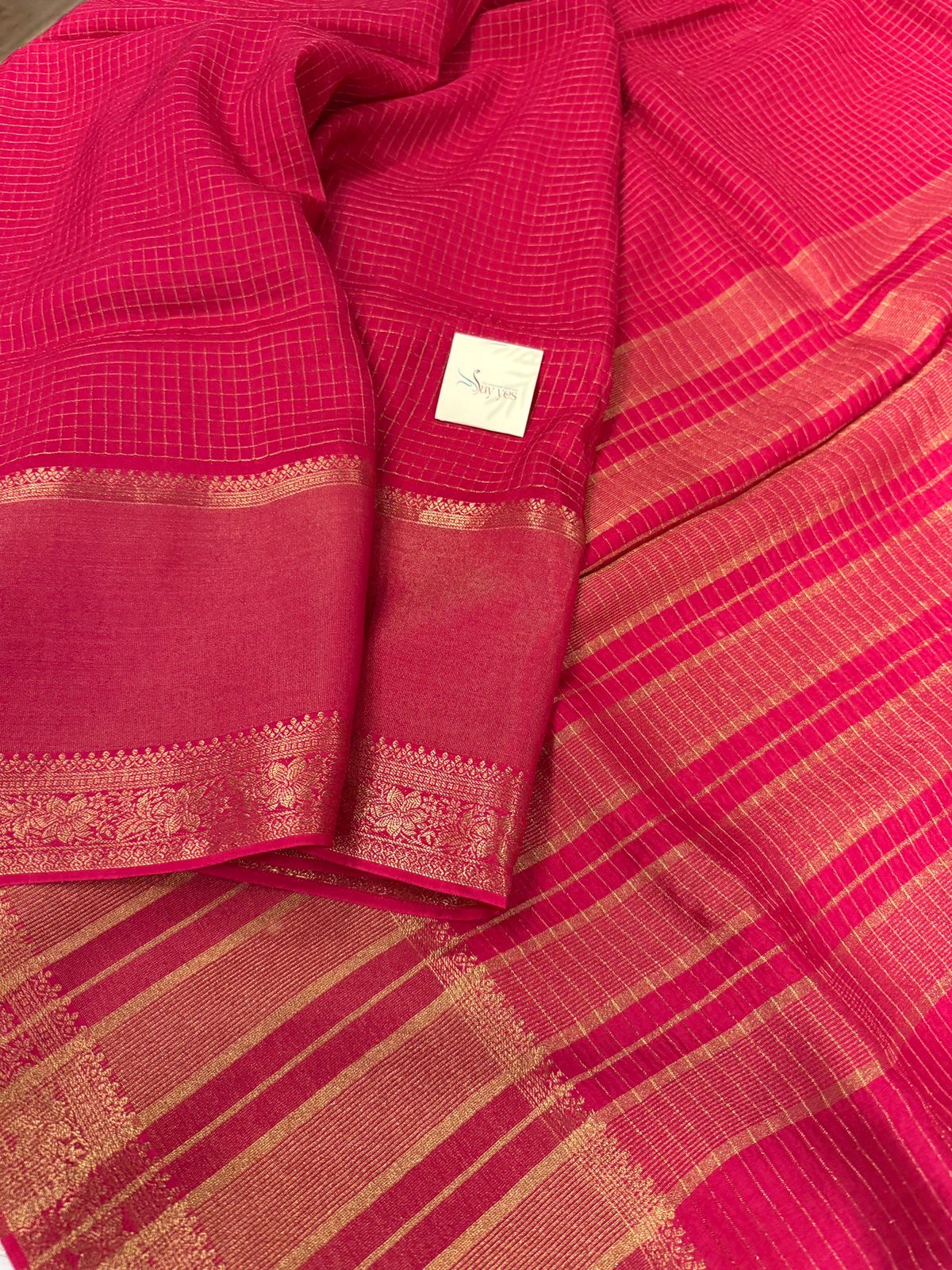 Drape yourself in timeless elegance with this exquisite Banarasi Georgette Saree in a regal Rani pink. Woven on traditional looms, the saree features a delicate grid-check pattern across the body, accentuated with lustrous gold zari. The rich floral zari border and intricately striped pallu reflect the finesse of Banaras’ centuries-old weaving heritage. Crafted from lightweight georgette, it offers a graceful, flowing drape with a soft, comfortable feel — perfect for festive occasions, weddings, and special celebrations.