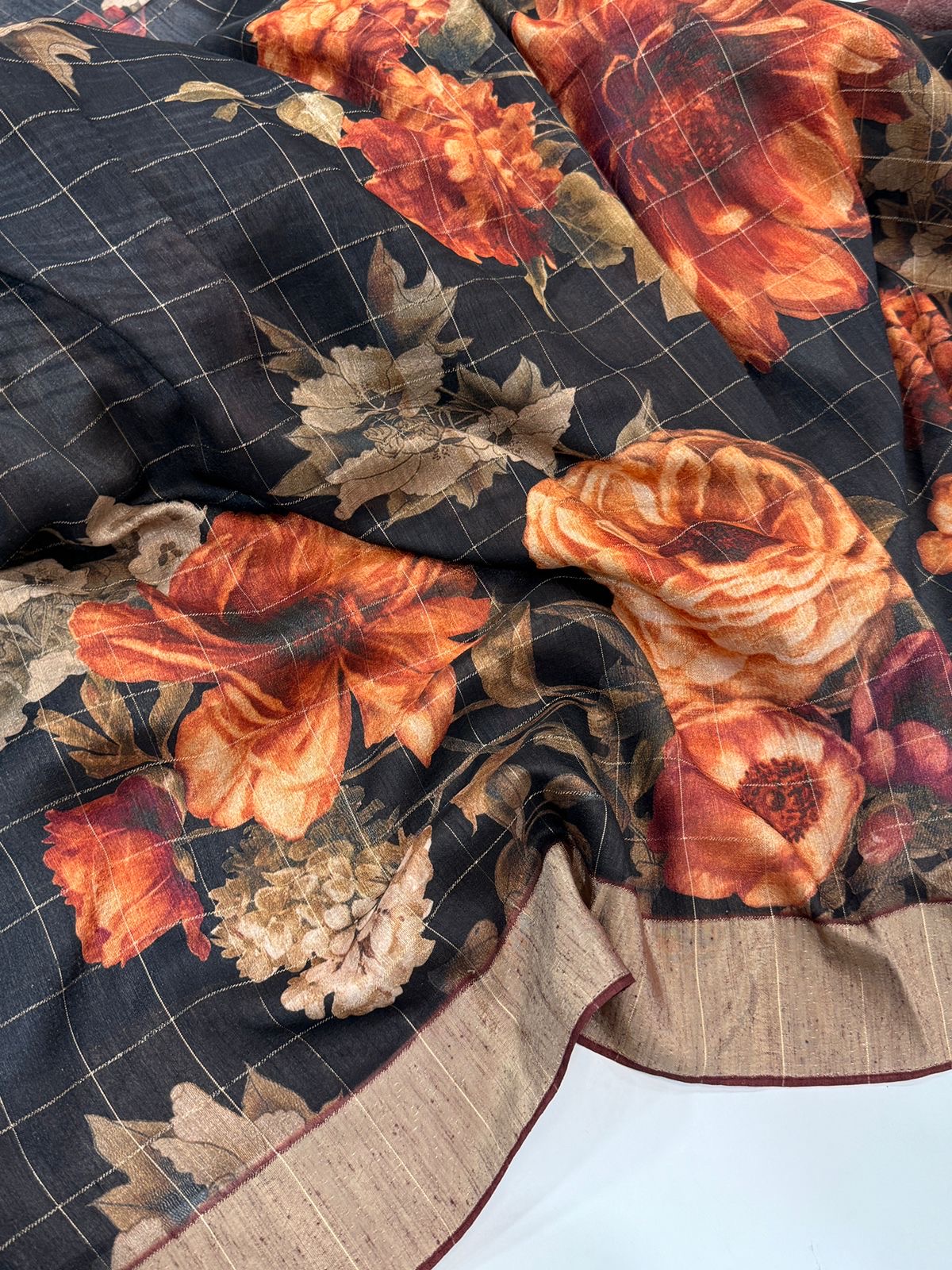 Introducing our Raw Silk Bloom Series, a curated collection of elegant ready-to-wear sarees crafted in rich, textured raw silk. Each saree features large painterly floral motifs that create a stunning visual story — soft, fluid petals set against a backdrop of muted grids and earthy borders. The interplay of deep blues, warm beiges, and hand-brushed watercolor tones gives every piece a modern artistic charm.