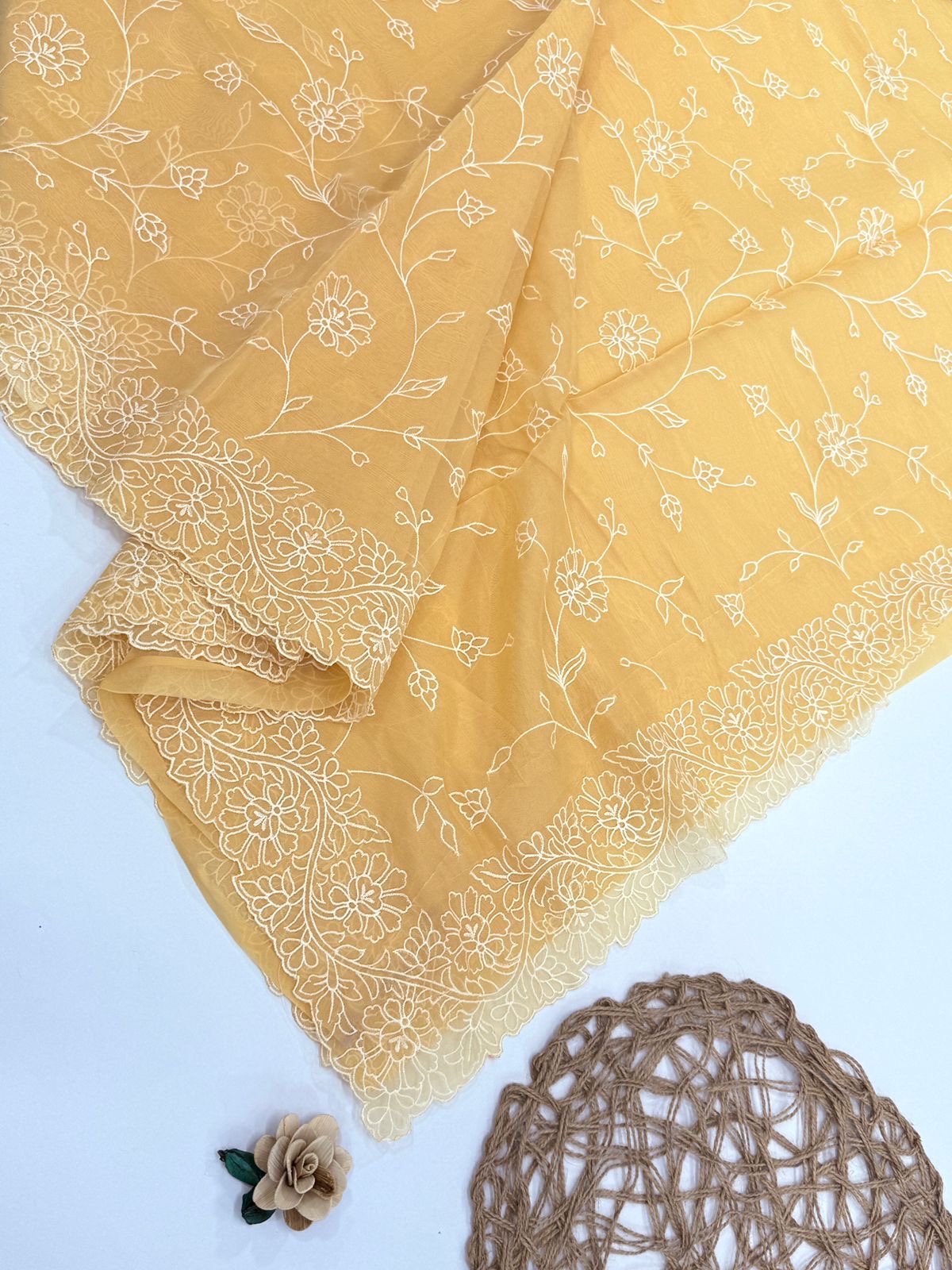 - Design: Intricate thread embroidery on pastel hues