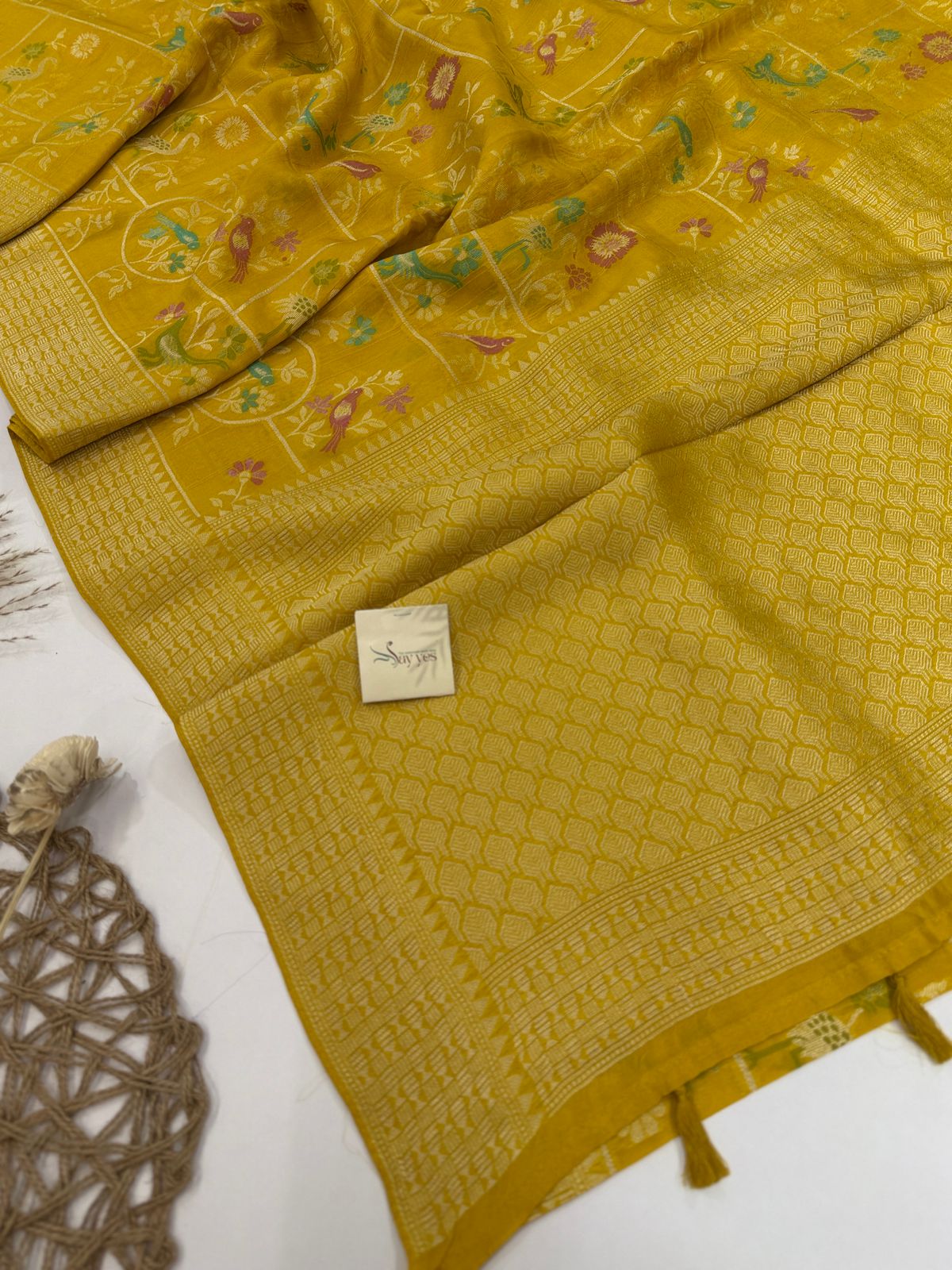 Elevate your ethnic wardrobe with this exquisite Banarasi Paithani saree in mustard yellow, a masterpiece that blends the rich weaving traditions of Banaras and Paithani. Crafted in luxurious silk, the saree features intricate zari work with a stunning blend of floral motifs, peacocks, parrots, and traditional vines, symbolizing prosperity and grace. The golden zari border and pallu showcase geometric artistry, enhancing its timeless charm. Lightweight yet regal, this saree is perfect for weddings, festive occasions, and grand celebrations.
