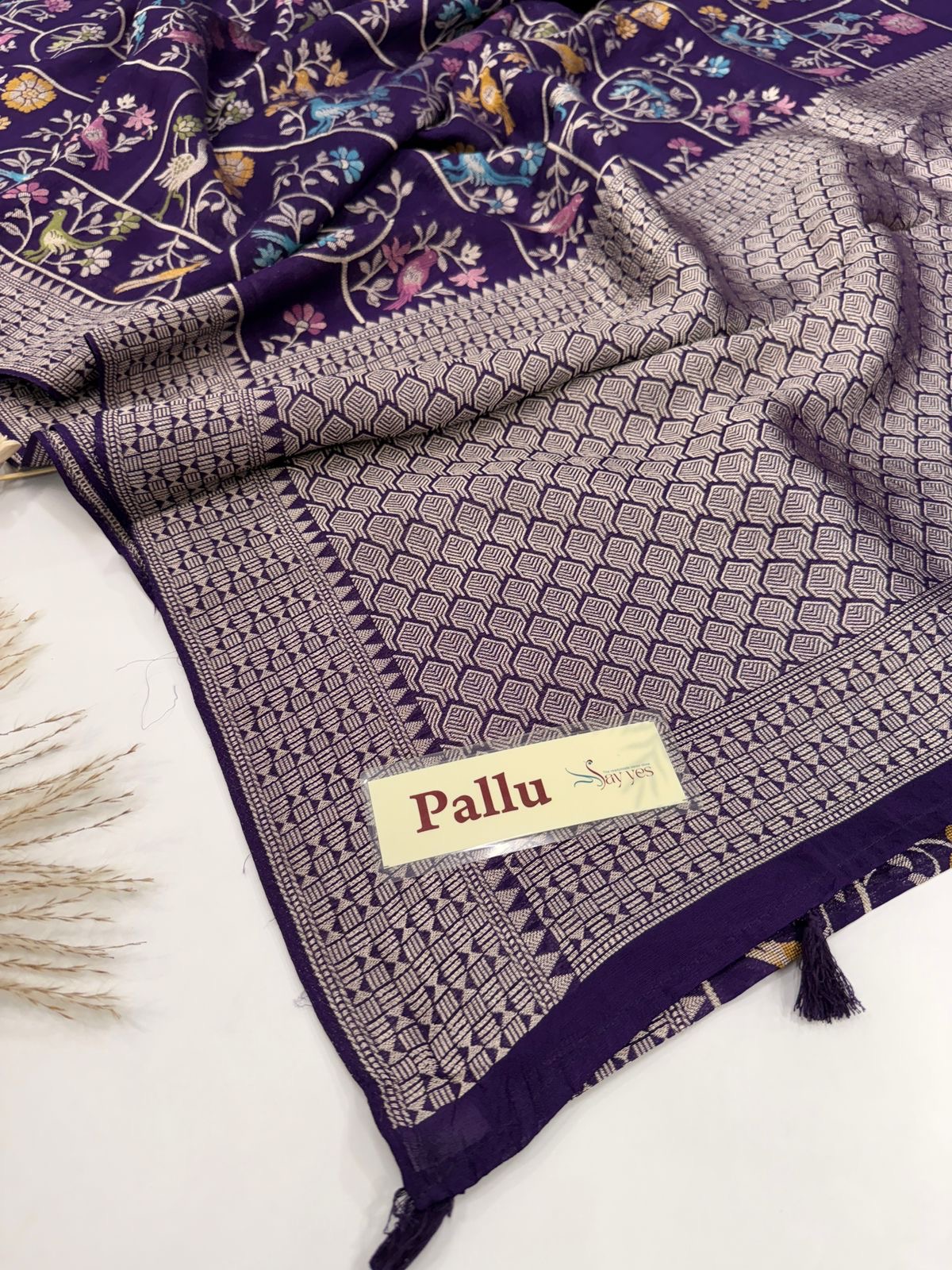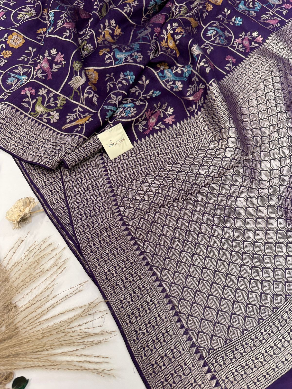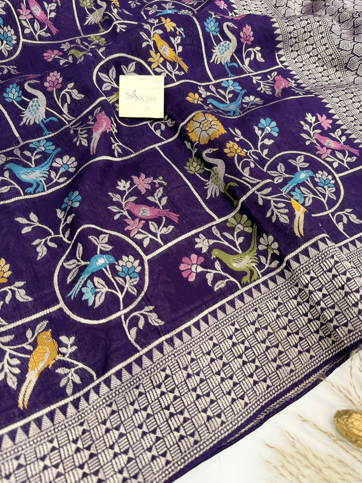 Elevate your ethnic wardrobe with this exquisite Banarasi Paithani saree in Deep Violet , a masterpiece that blends the rich weaving traditions of Banaras and Paithani. Crafted in luxurious silk, the saree features intricate zari work with a stunning blend of floral motifs, peacocks, parrots, and traditional vines, symbolizing prosperity and grace. The golden zari border and pallu showcase geometric artistry, enhancing its timeless charm. Lightweight yet regal, this saree is perfect for weddings, festive occasions, and grand celebrations.