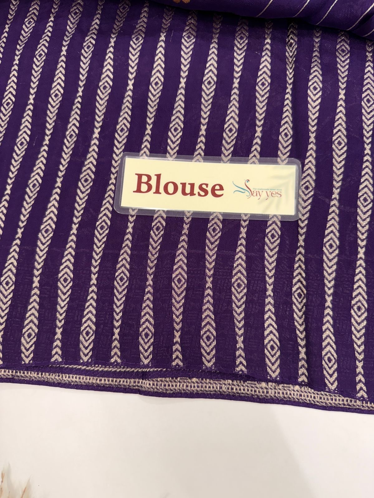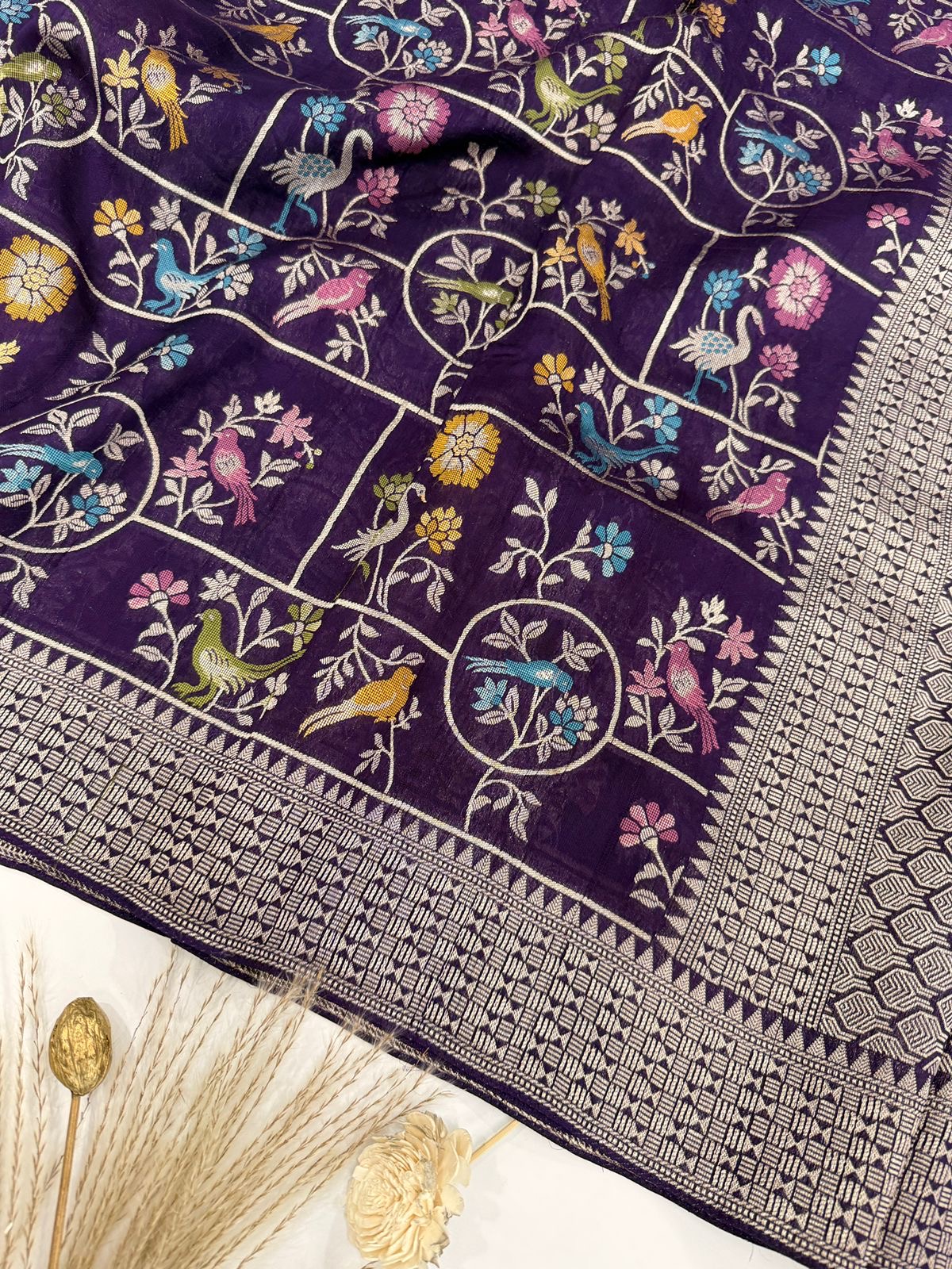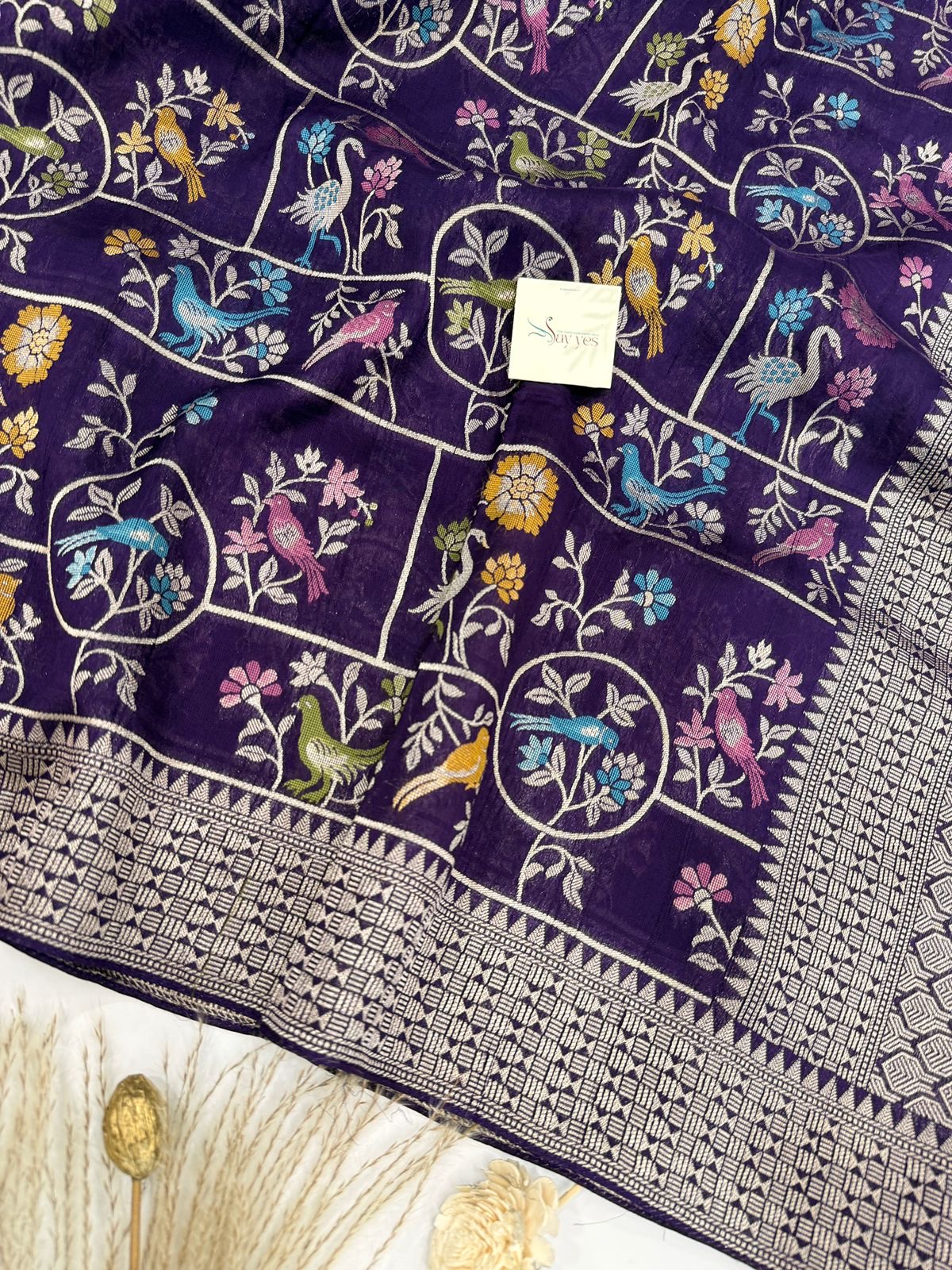 Elevate your ethnic wardrobe with this exquisite Banarasi Paithani saree in Deep Violet , a masterpiece that blends the rich weaving traditions of Banaras and Paithani. Crafted in luxurious silk, the saree features intricate zari work with a stunning blend of floral motifs, peacocks, parrots, and traditional vines, symbolizing prosperity and grace. The golden zari border and pallu showcase geometric artistry, enhancing its timeless charm. Lightweight yet regal, this saree is perfect for weddings, festive occasions, and grand celebrations.