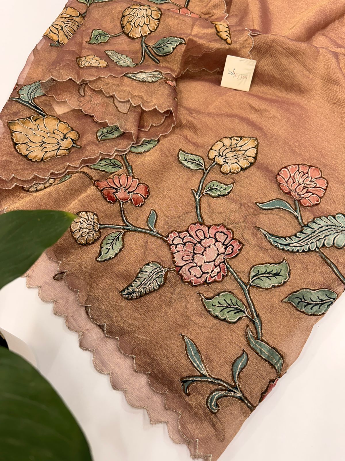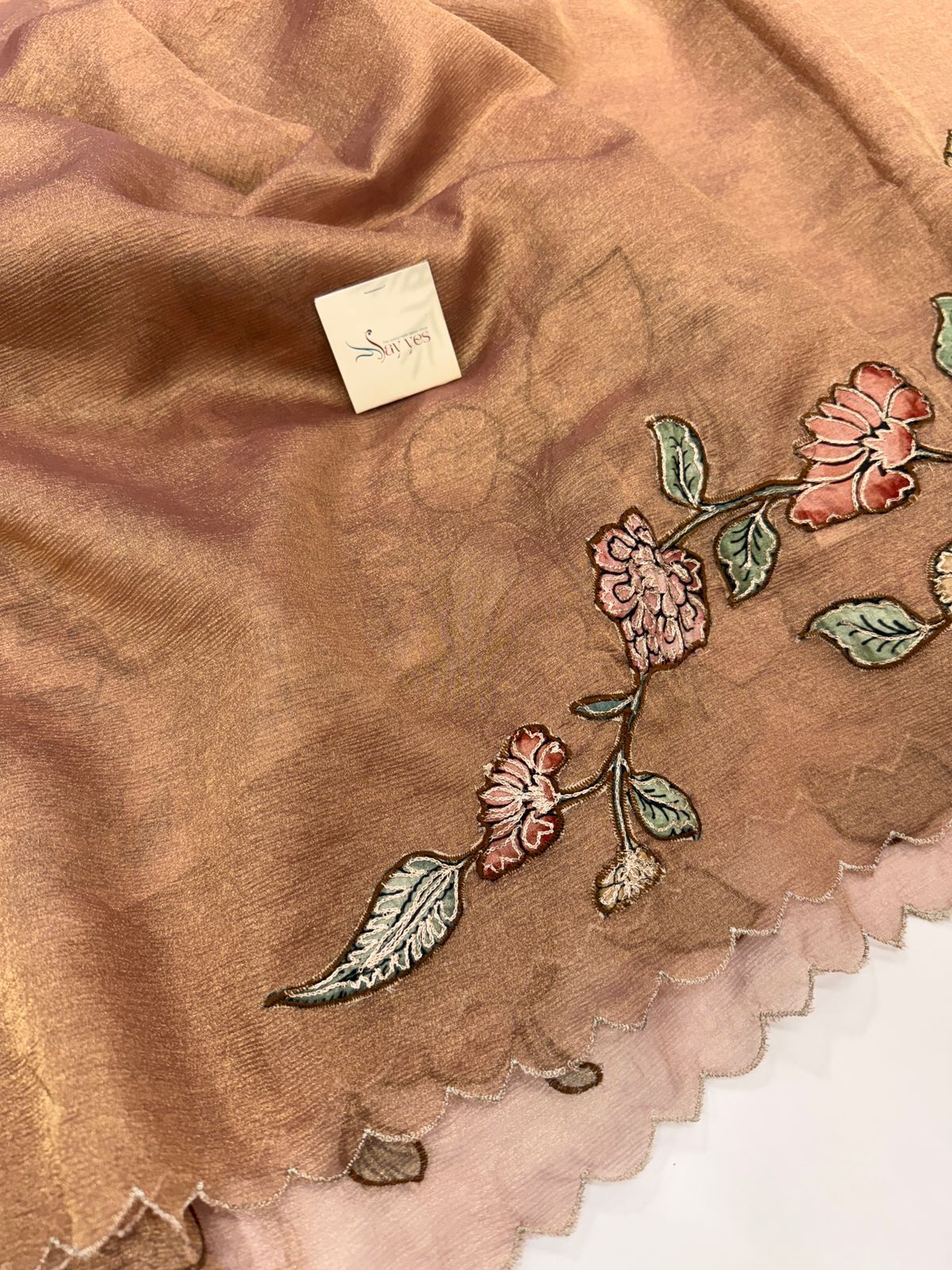 Step into timeless elegance with this crushed tissue silk saree in dusty peach adorned with delicate floral appliqué embroidery in shades of coral, blush pink, and mustard. The lightweight tissue silk fabric creates a soft crushed texture that shimmers beautifully under light, giving the saree an ethereal appeal. The scalloped edges and hand-detailed floral vines add a touch of artistry, making it a statement piece for weddings, receptions, and festive occasions. Draping this saree is like wearing poetry—subtle, graceful, and unforgettable.