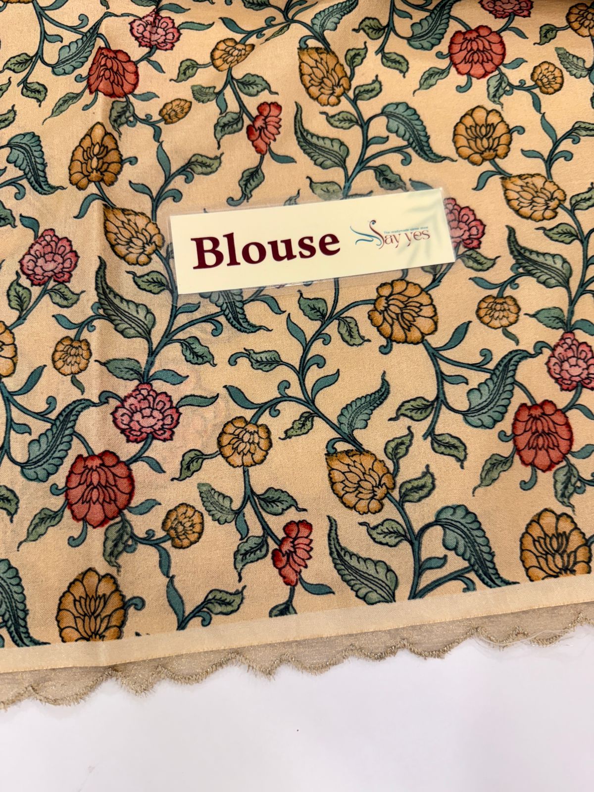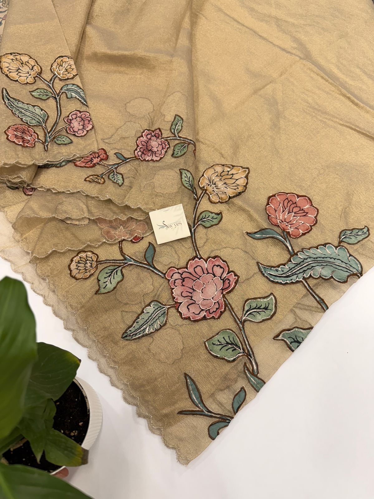 Step into timeless elegance with this crushed tissue silk saree in muted gold, adorned with delicate floral appliqué embroidery in shades of coral, blush pink, and mustard. The lightweight tissue silk fabric creates a soft crushed texture that shimmers beautifully under light, giving the saree an ethereal appeal. The scalloped edges and hand-detailed floral vines add a touch of artistry, making it a statement piece for weddings, receptions, and festive occasions. Draping this saree is like wearing poetry—subtle, graceful, and unforgettable.