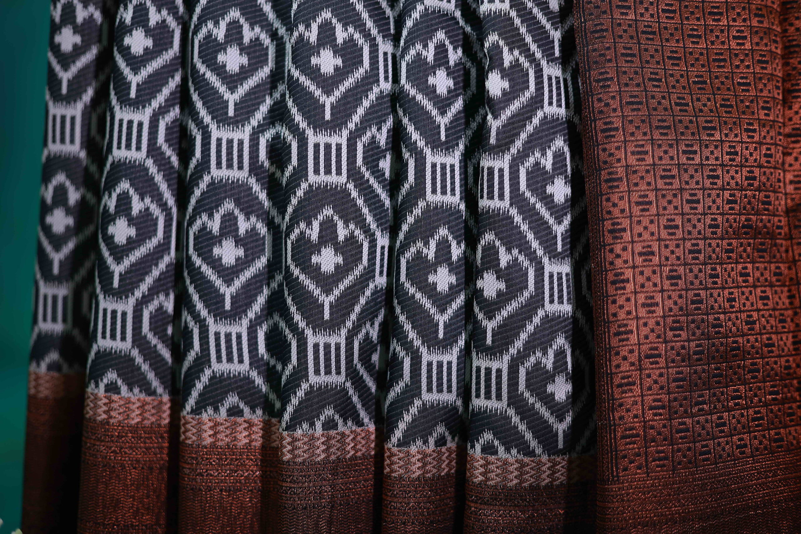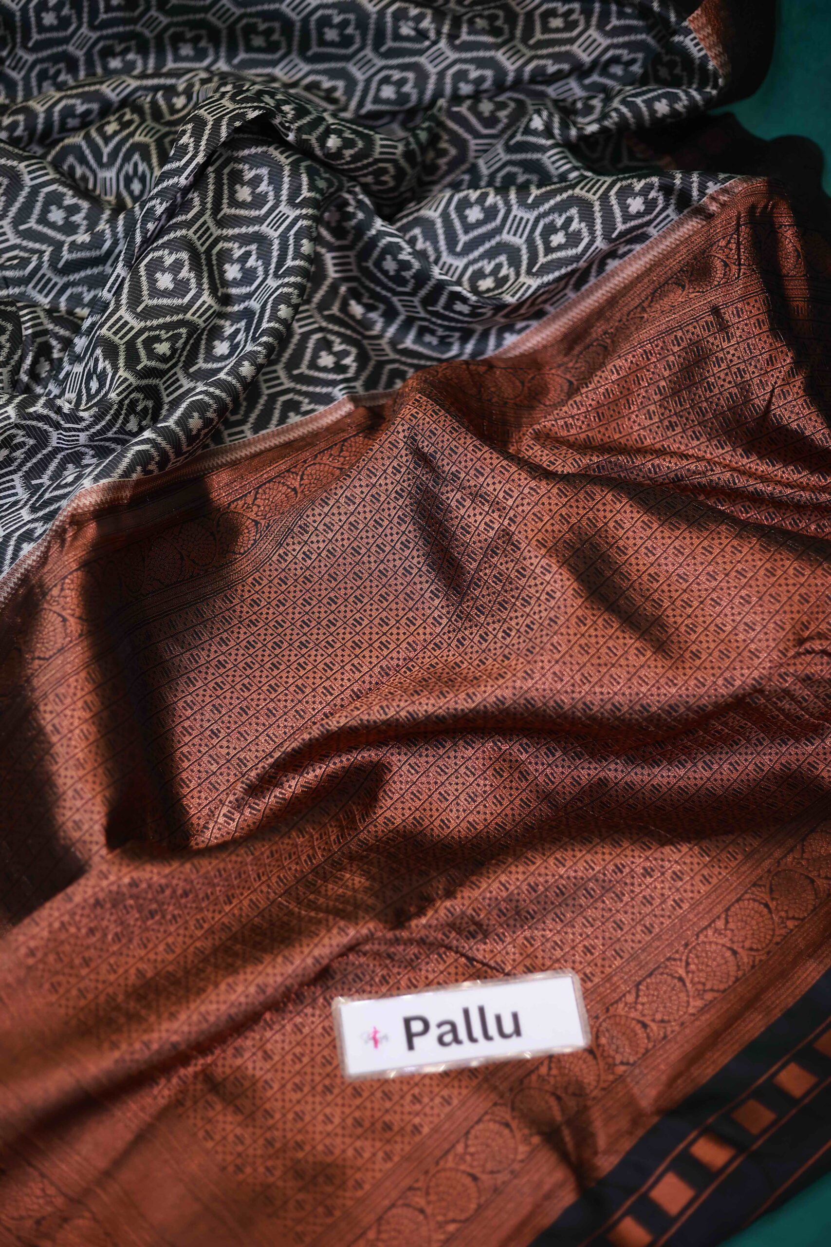 We have ingeniously chosen this piece of soft semi silk which is a perfect confluence of ikkat zari woven buttas on the body and a rich pallu in contrast elegantly to suit every Indian Occasion. Perfect to wear for Weddings and auspicious days.
