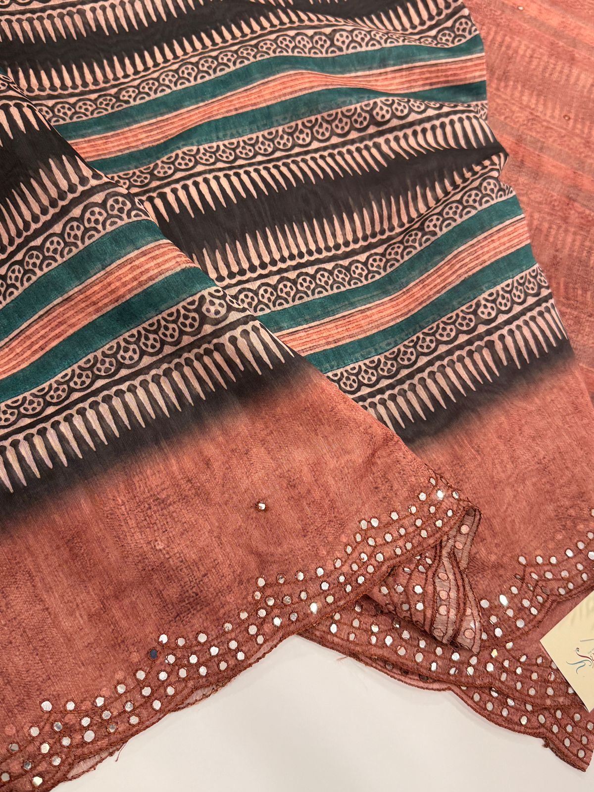 Woven from wild silk, Tussar is known for its rich texture, natural sheen, and breathable quality. Unlike highly-polished silks, Tussar retains its raw, organic charm, giving it a matte-luxe finish that feels earthy yet elevated.