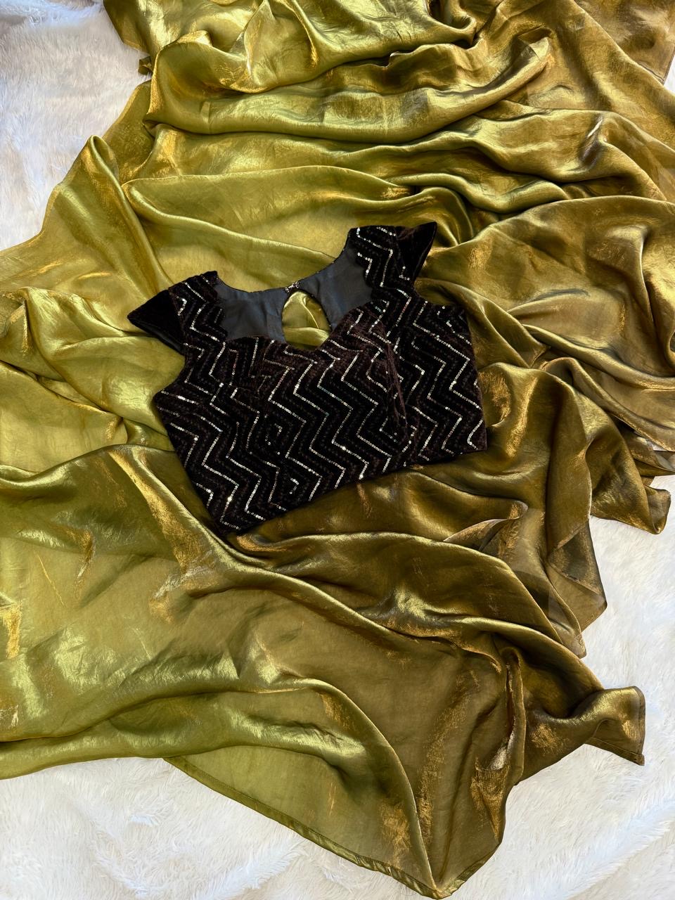 Paired with a hand-embroidered black velvet blouse, this ensemble brings the perfect contrast — soft glow meets rich texture, modern elegance meets timeless glam.