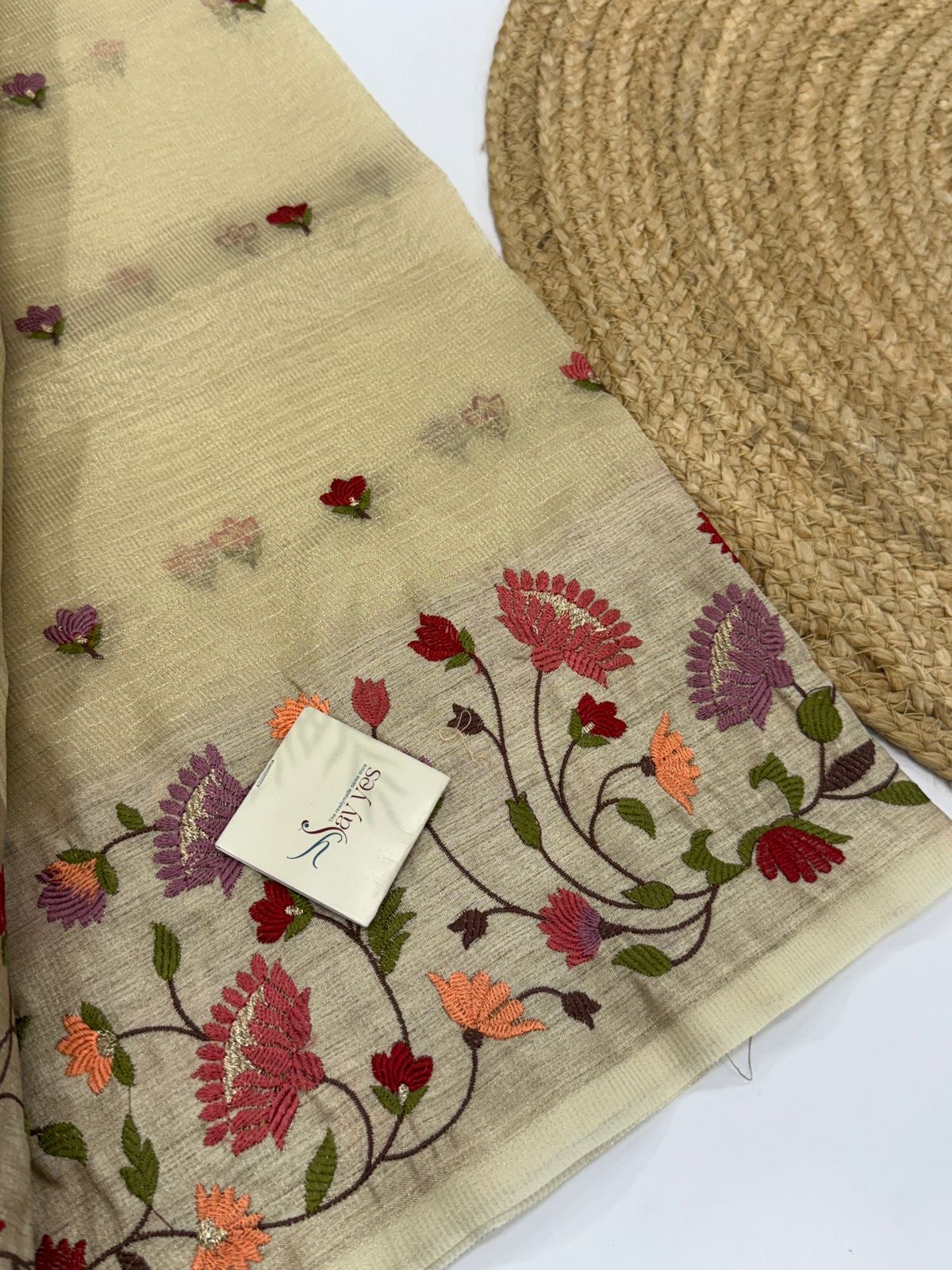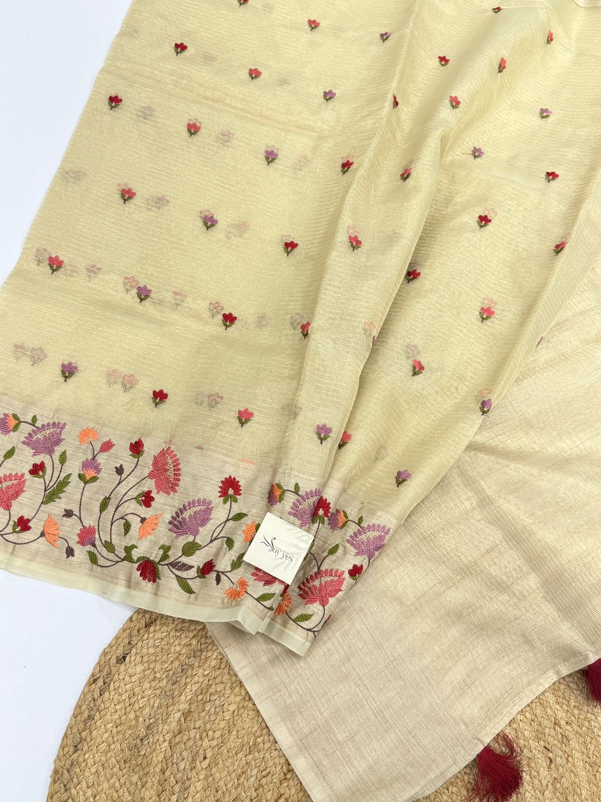 A dreamy Kora Tissue Silk saree in a buttermilk yellow, sprinkled with dainty hand-embroidered florals and finished with a rich garden-inspired border. Lightweight, sheer, and naturally crisp, this Kora Tissue weave blends the subtle shine of tissue with the airy structure of kora silk—giving you an elegant drape that holds its shape beautifully. A perfect balance of grace and charm for effortless festive styling.