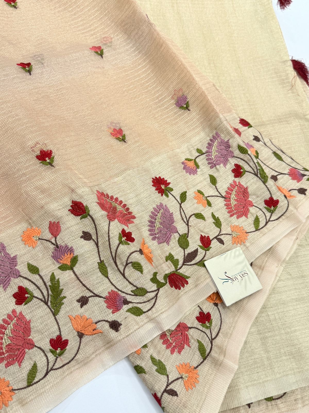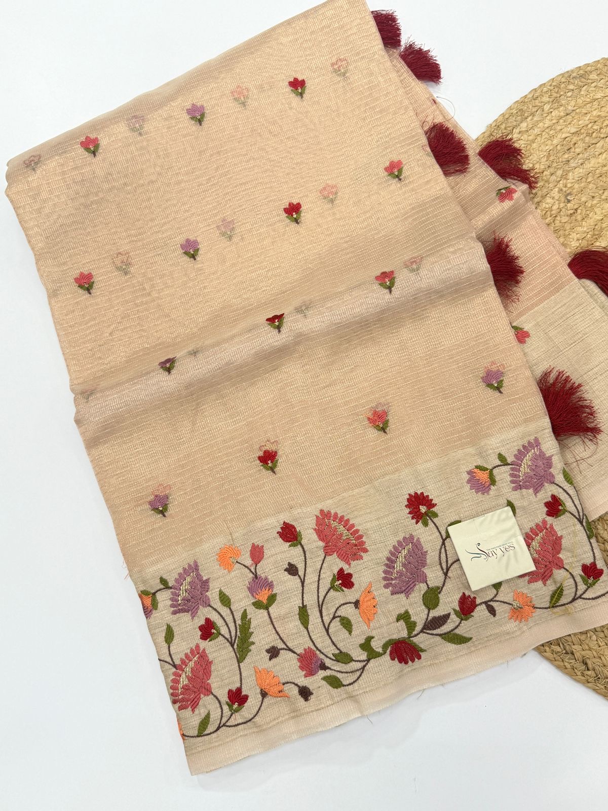 A dreamy Kora Tissue Silk saree in a peach, sprinkled with dainty hand-embroidered florals and finished with a rich garden-inspired border. Lightweight, sheer, and naturally crisp, this Kora Tissue weave blends the subtle shine of tissue with the airy structure of kora silk—giving you an elegant drape that holds its shape beautifully. A perfect balance of grace and charm for effortless festive styling.