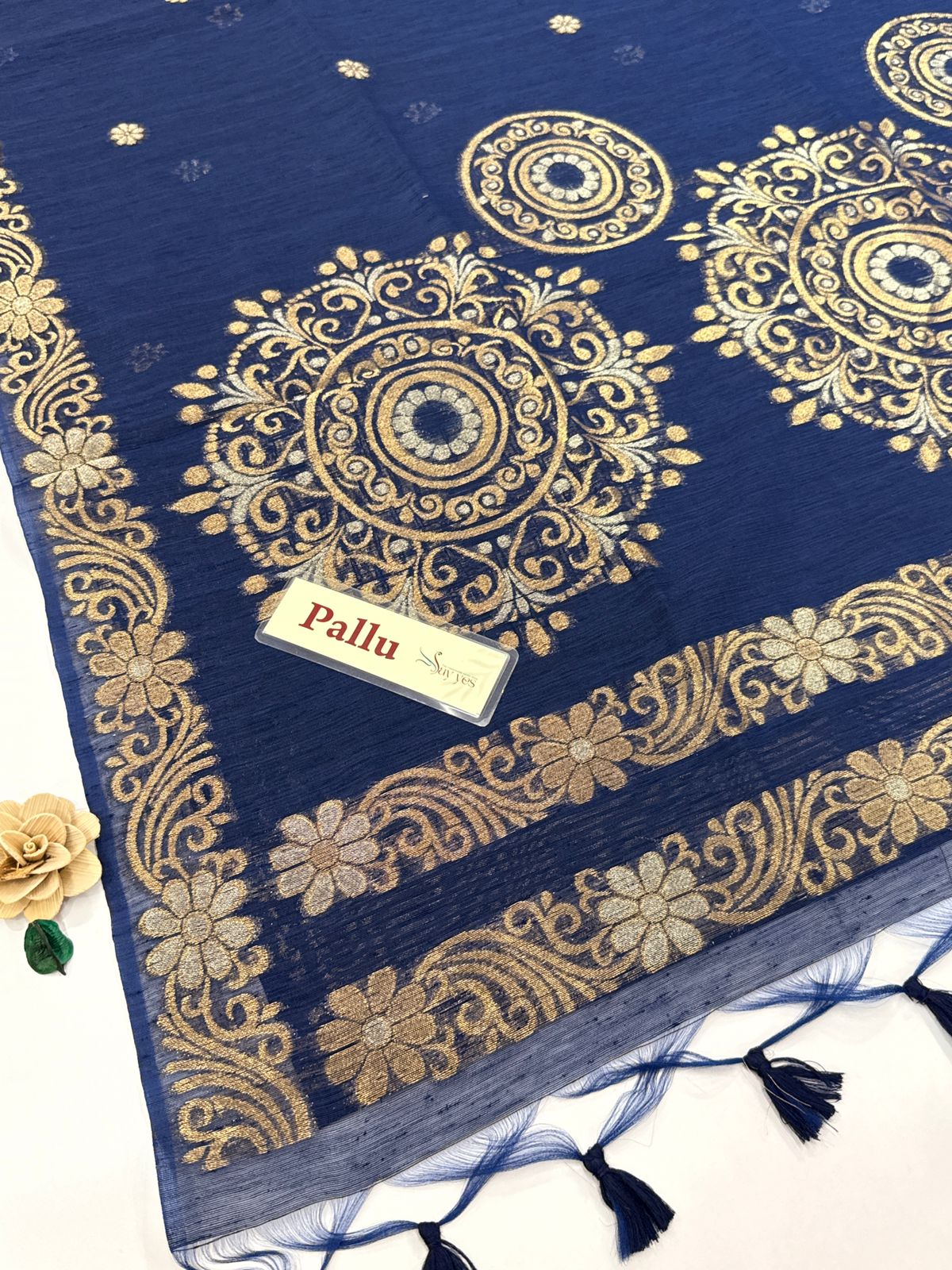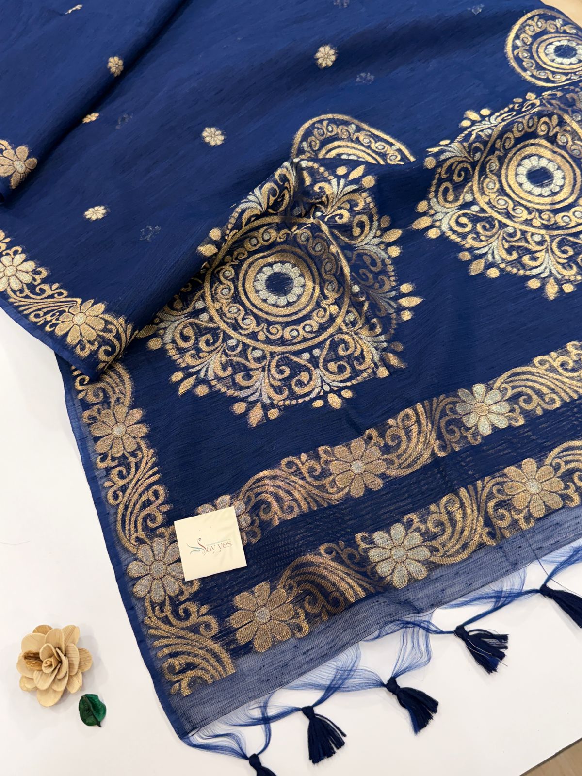 Made from a luxurious silk-cotton blend, this saree combines the sheen of silk with the comfort of cotton. It drapes beautifully, feels soft against the skin, and offers just the right amount of structure for an elegant fall. Lightweight yet grand, it’s ideal for those who seek effortless traditional beauty.