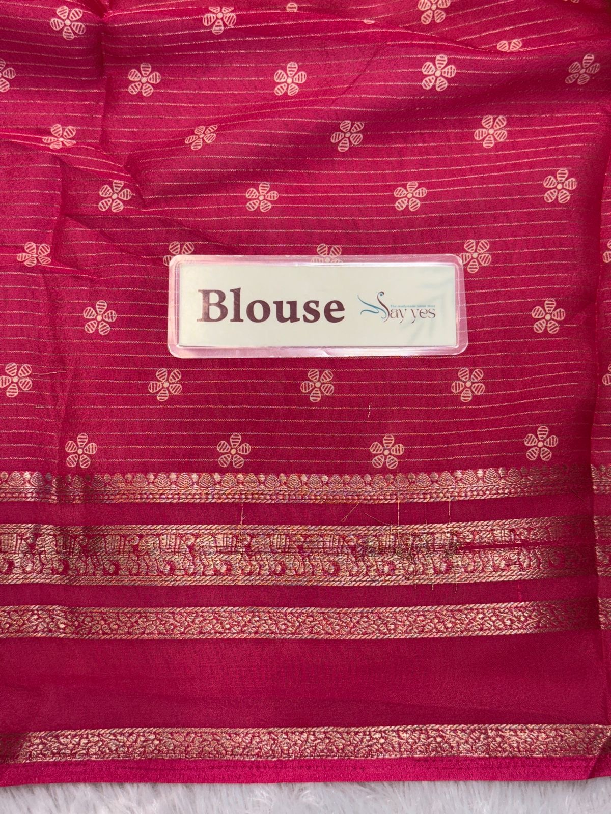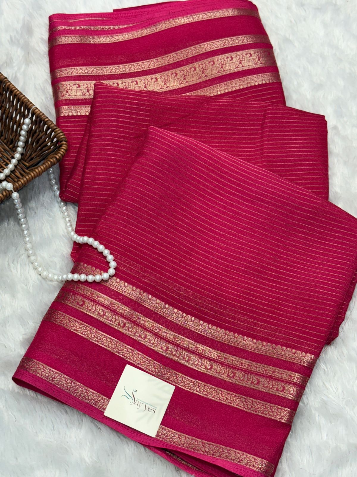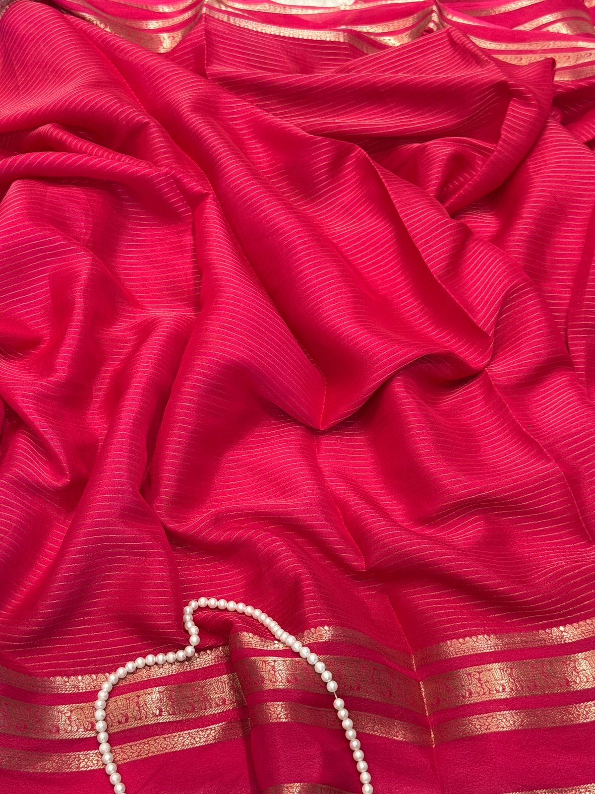 A graceful blend of softness and sheen, this semi Mysore crepe silk saree is crafted for women who love understated luxury. Rendered in a rich pink hue with delicate gold zari checkers, the fabric flows effortlessly, creating a fluid, elegant drape. The subtle contrast border adds depth without overpowering the design, making it perfect for both refined celebrations and elegant daytime occasions.