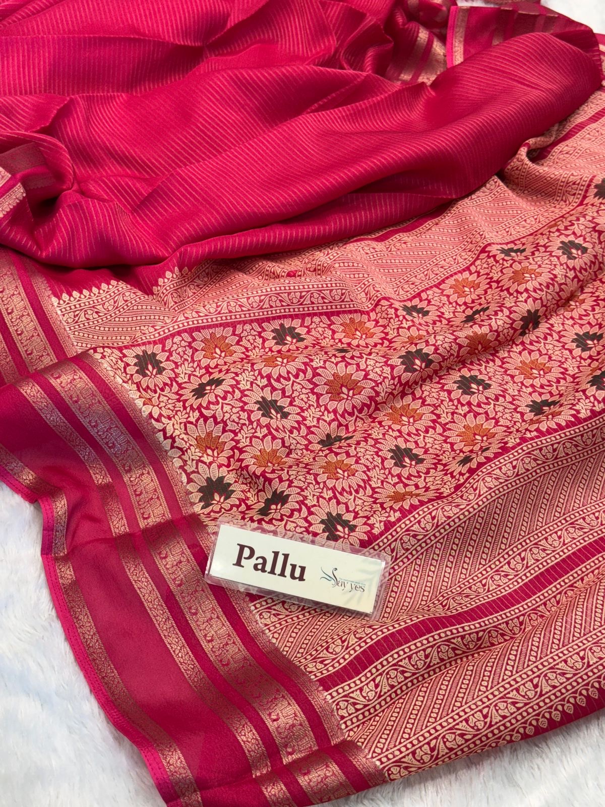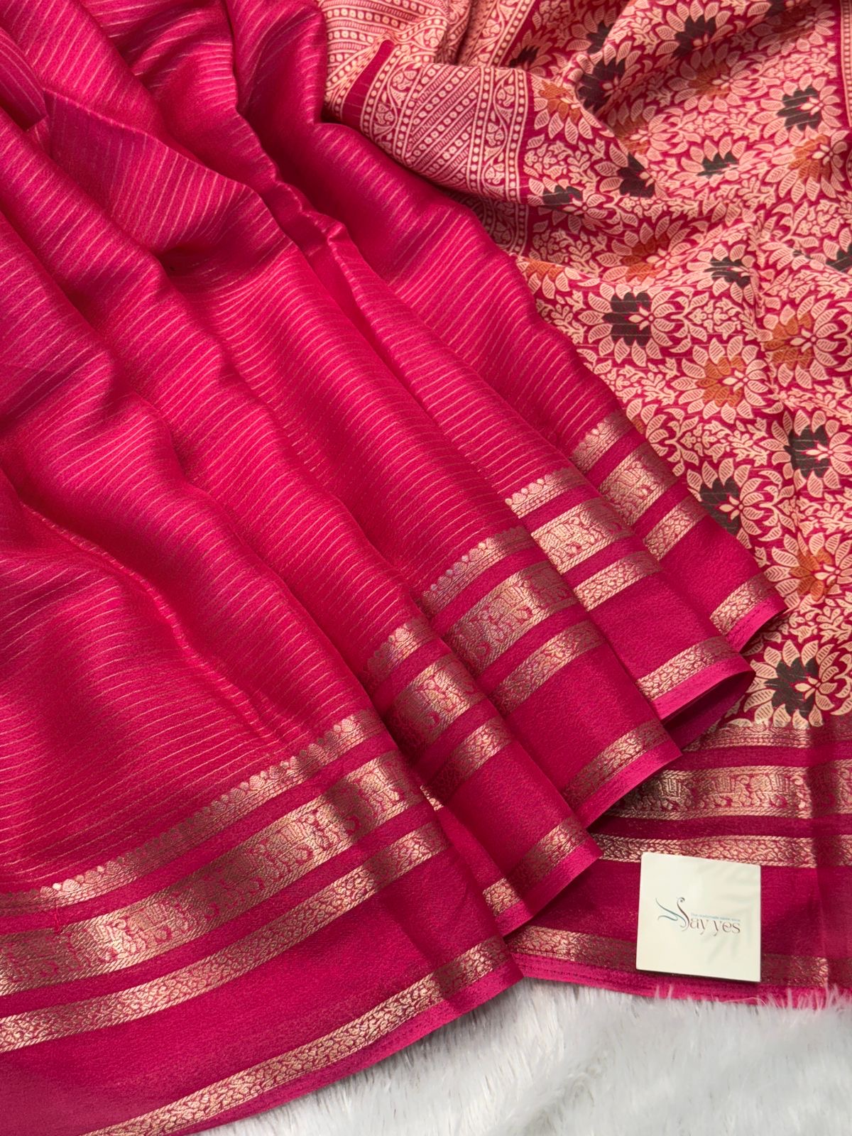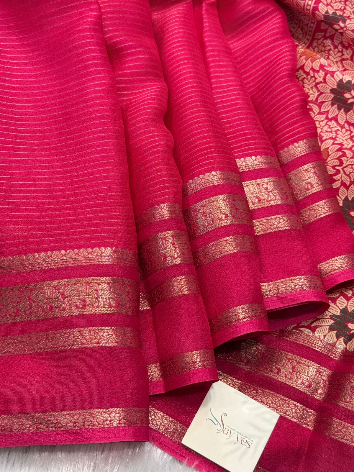 A graceful blend of softness and sheen, this semi Mysore crepe silk saree is crafted for women who love understated luxury. Rendered in a rich pink hue with delicate gold zari checkers, the fabric flows effortlessly, creating a fluid, elegant drape. The subtle contrast border adds depth without overpowering the design, making it perfect for both refined celebrations and elegant daytime occasions.