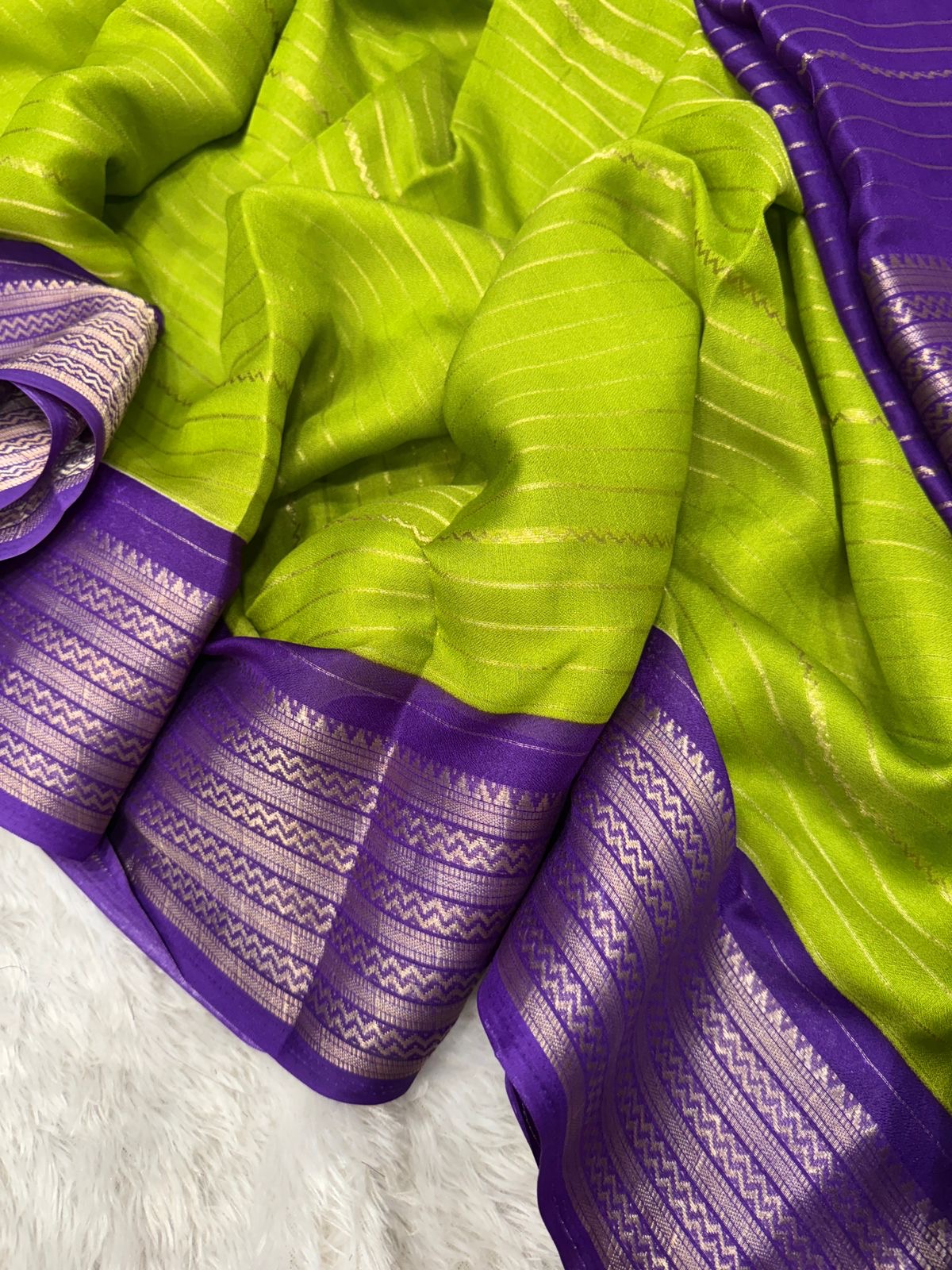 A graceful blend of softness and sheen, this semi Mysore crepe silk saree is crafted for women who love understated luxury. Rendered in a rich violet hue with delicate silver zari stripes, the fabric flows effortlessly, creating a fluid, elegant drape. The subtle contrast border adds depth without overpowering the design, making it perfect for both refined celebrations and elegant daytime occasions.