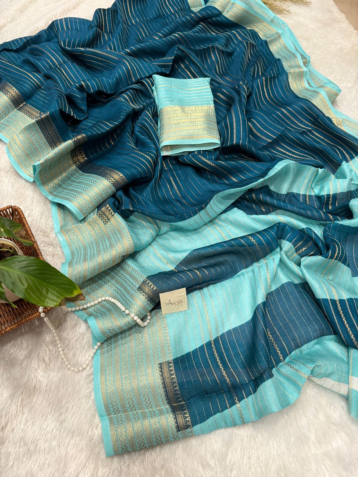 Lightweight yet regal, this saree moves beautifully with you—never stiff, never heavy—just quietly luxurious.