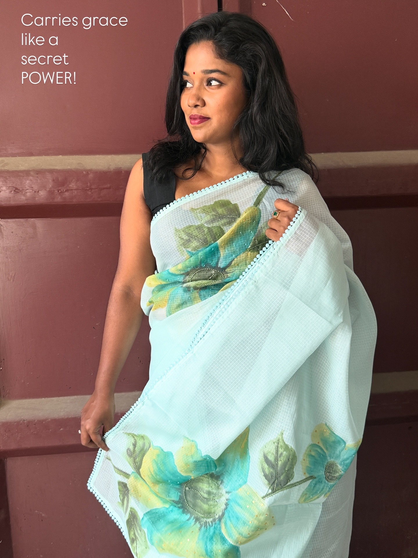 A whisper of elegance in every fold — this pure Kota Doria saree is hand-painted with delicate floral strokes in soft yellow, green, and grey hues. The airy texture of Kota cotton gives it a sheer, weightless grace, while tiny sequins add a gentle shimmer. A perfect blend of art and fabric, crafted for women who love understated beauty.