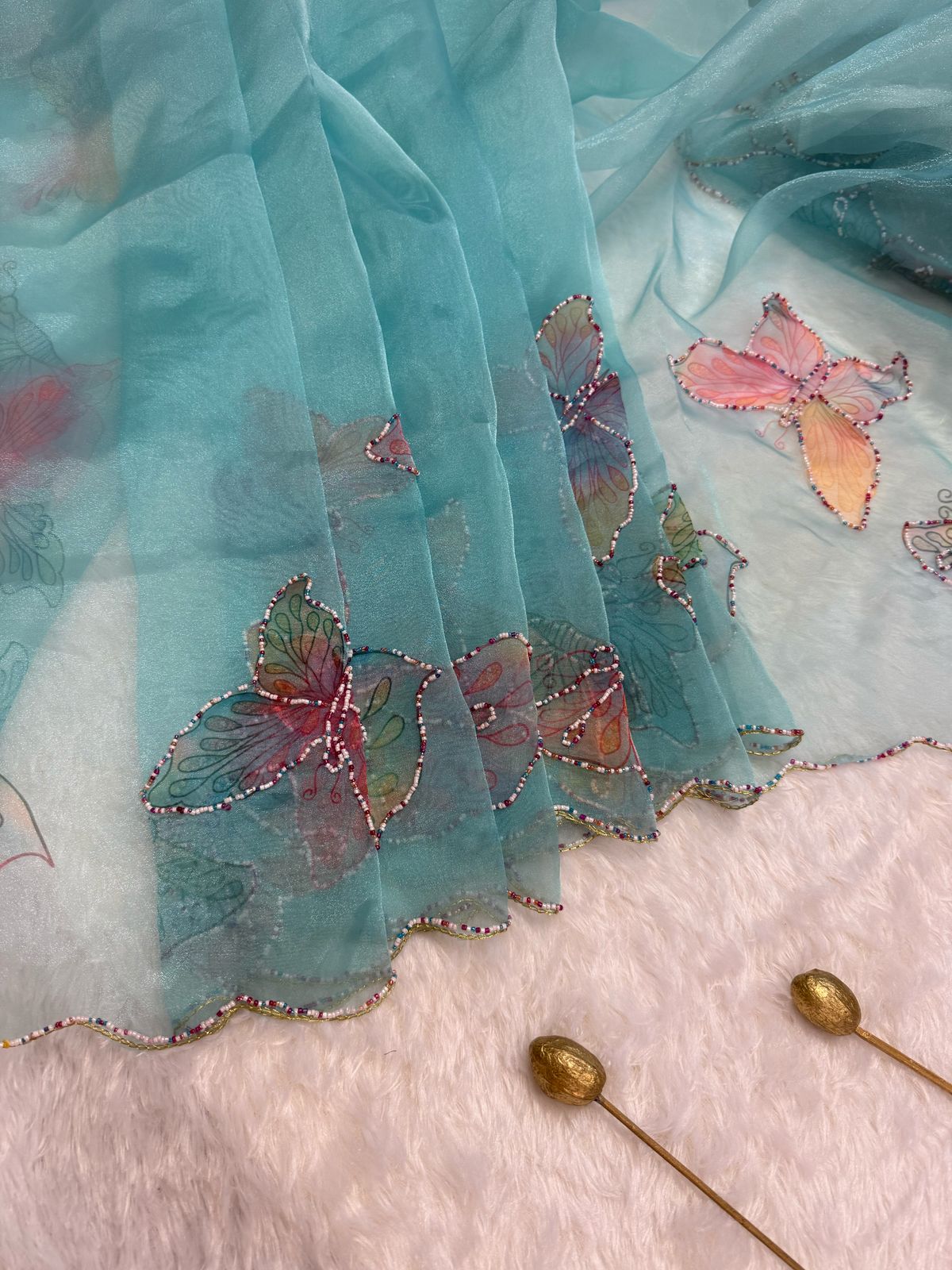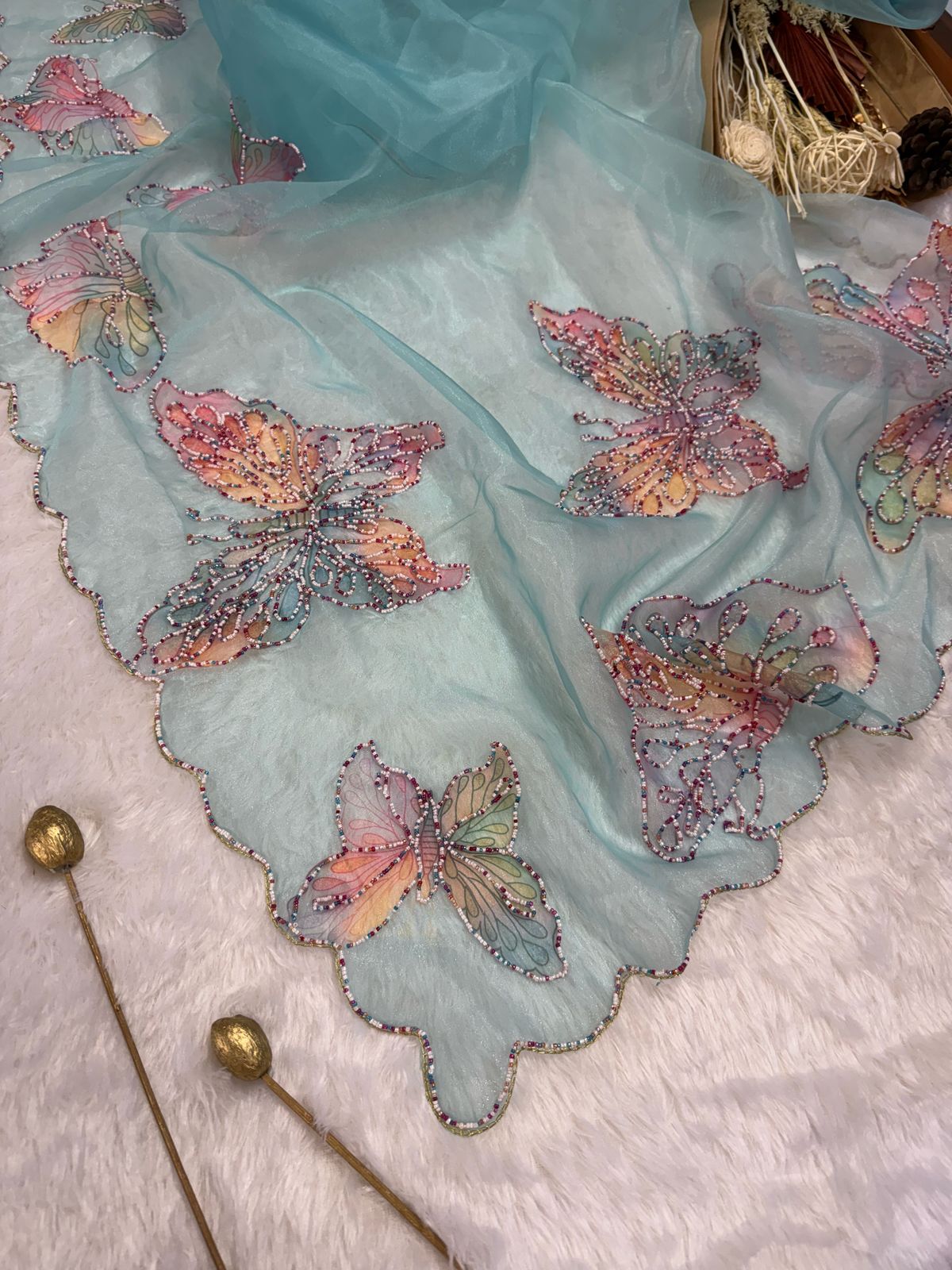 Float like a butterfly in this ethereal organza saree in a dreamy pastel aqua shade. Delicately adorned with hand-embroidered and beaded butterfly motifs, this saree exudes a whimsical charm. The iridescent detailing on the scalloped edges enhances its elegance, making it perfect for daytime soirees, garden parties, and festive occasions. Light, airy, and enchanting, this piece is a celebration of grace and transformation.