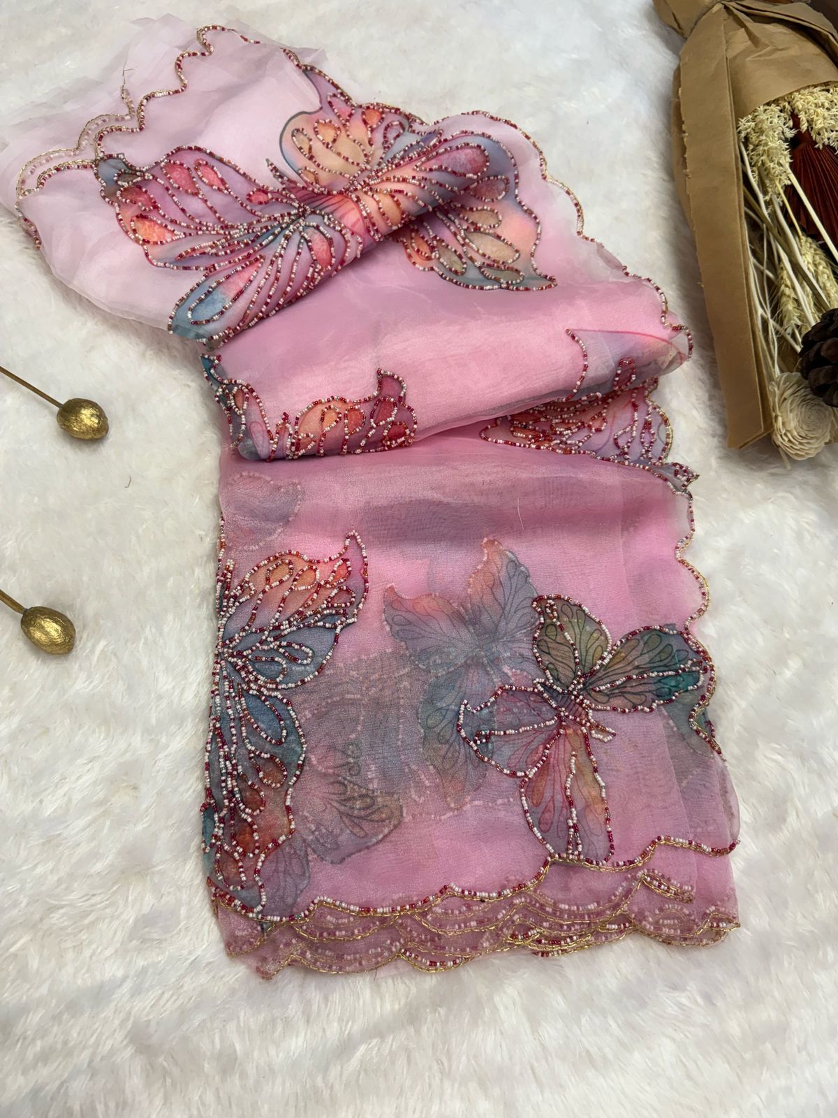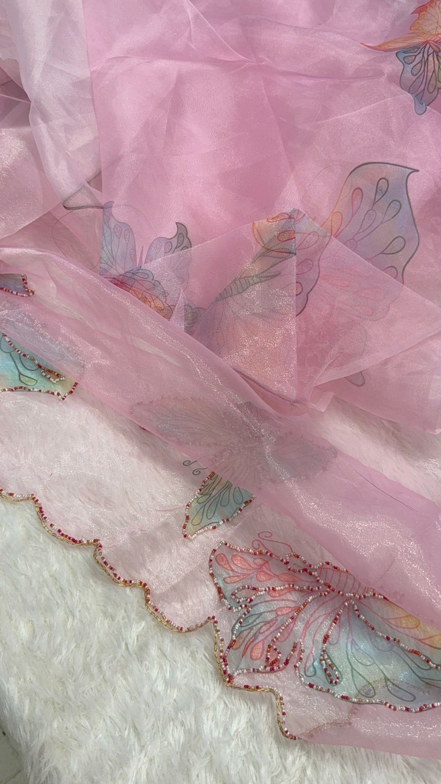 Float like a butterfly in this ethereal organza saree in a dreamy pastel aqua shade. Delicately adorned with hand-embroidered and beaded butterfly motifs, this saree exudes a whimsical charm. The iridescent detailing on the scalloped edges enhances its elegance, making it perfect for daytime soirees, garden parties, and festive occasions. Light, airy, and enchanting, this piece is a celebration of grace and transformation.