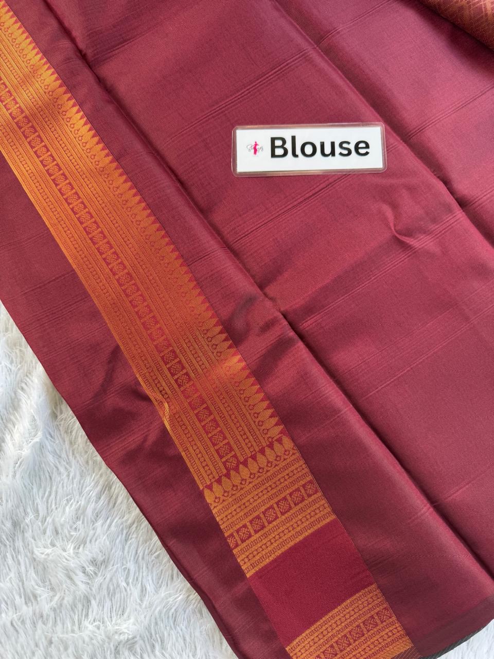This saree showcases a rich, traditional design with a striking blend of bottle green and maroon tones. The upper portion features a sophisticated checkered pattern, offering a classic, regal feel. The saree’s border is decorated with intricate motifs in earthy green and gold, adding an elegant contrast. The fabric has a lustrous sheen, perfect for formal or festive occasions. Paired with timeless accessories, this saree would radiate a graceful and refined look. The combination of colors and textures emphasizes heritage craftsmanship with a modern flair.