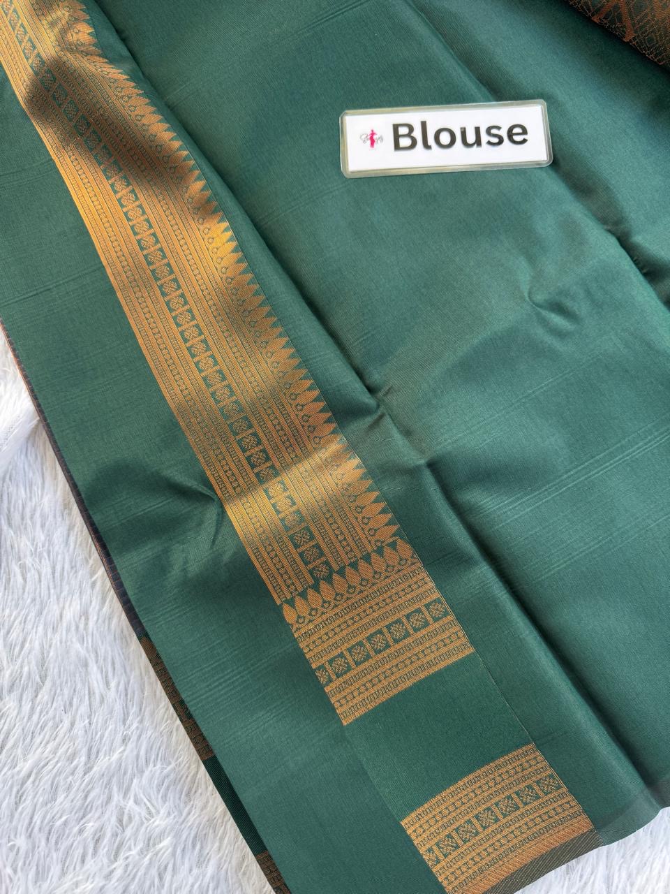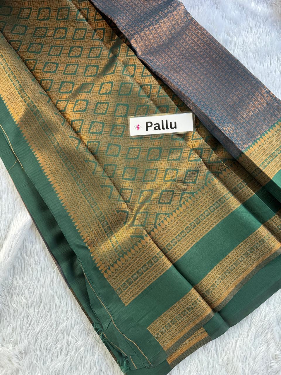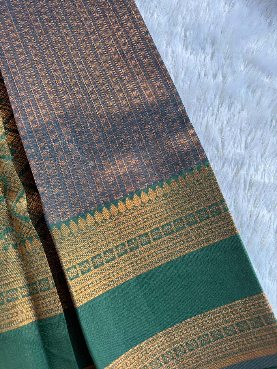 This saree showcases a rich, traditional design with a striking blend of Slate grey and dart green tones. The upper portion features a sophisticated checkered pattern, offering a classic, regal feel. The saree’s border is decorated with intricate motifs in earthy green and gold, adding an elegant contrast. The fabric has a lustrous sheen, perfect for formal or festive occasions. Paired with timeless accessories, this saree would radiate a graceful and refined look. The combination of colors and textures emphasizes heritage craftsmanship with a modern flair.