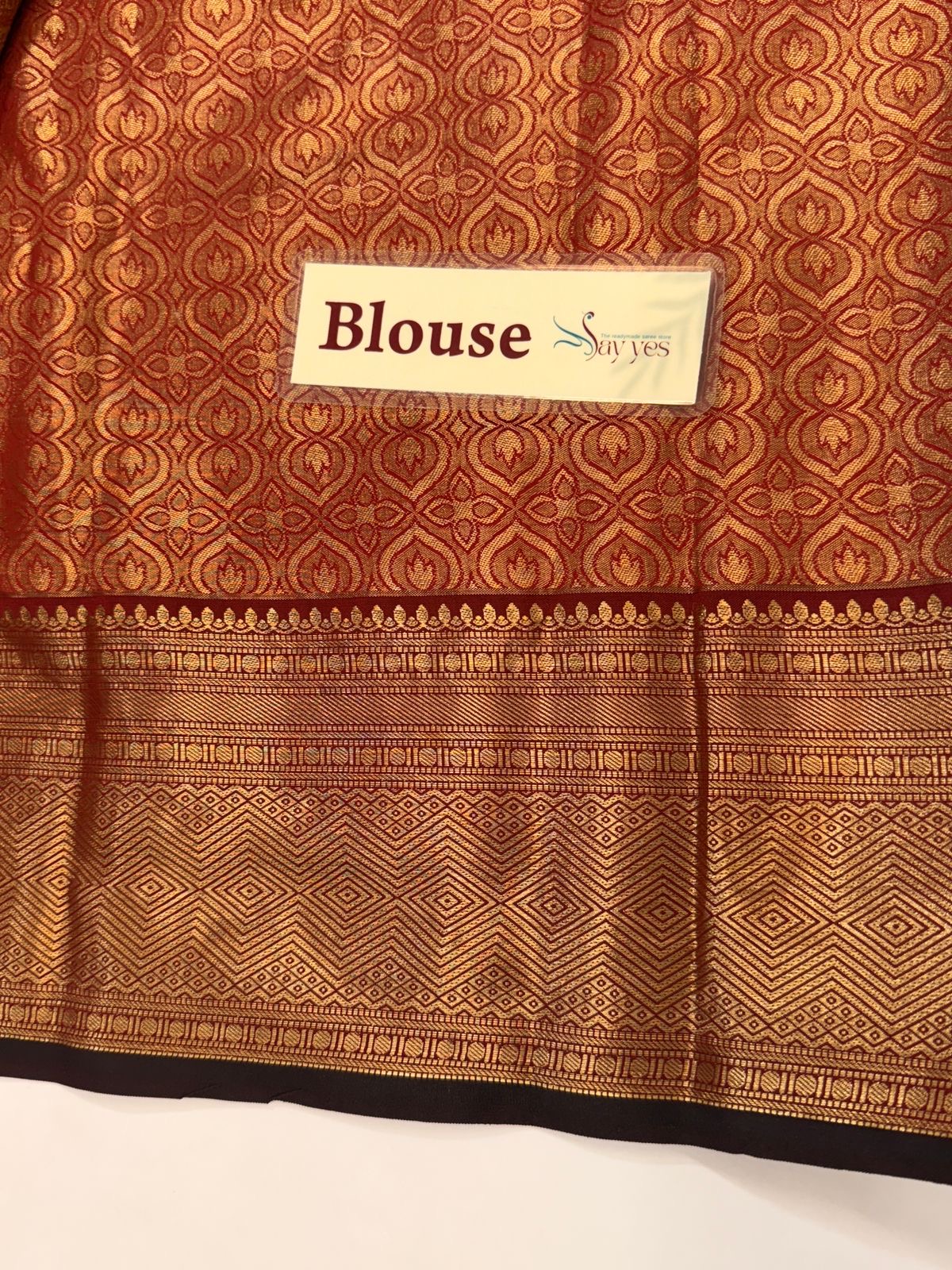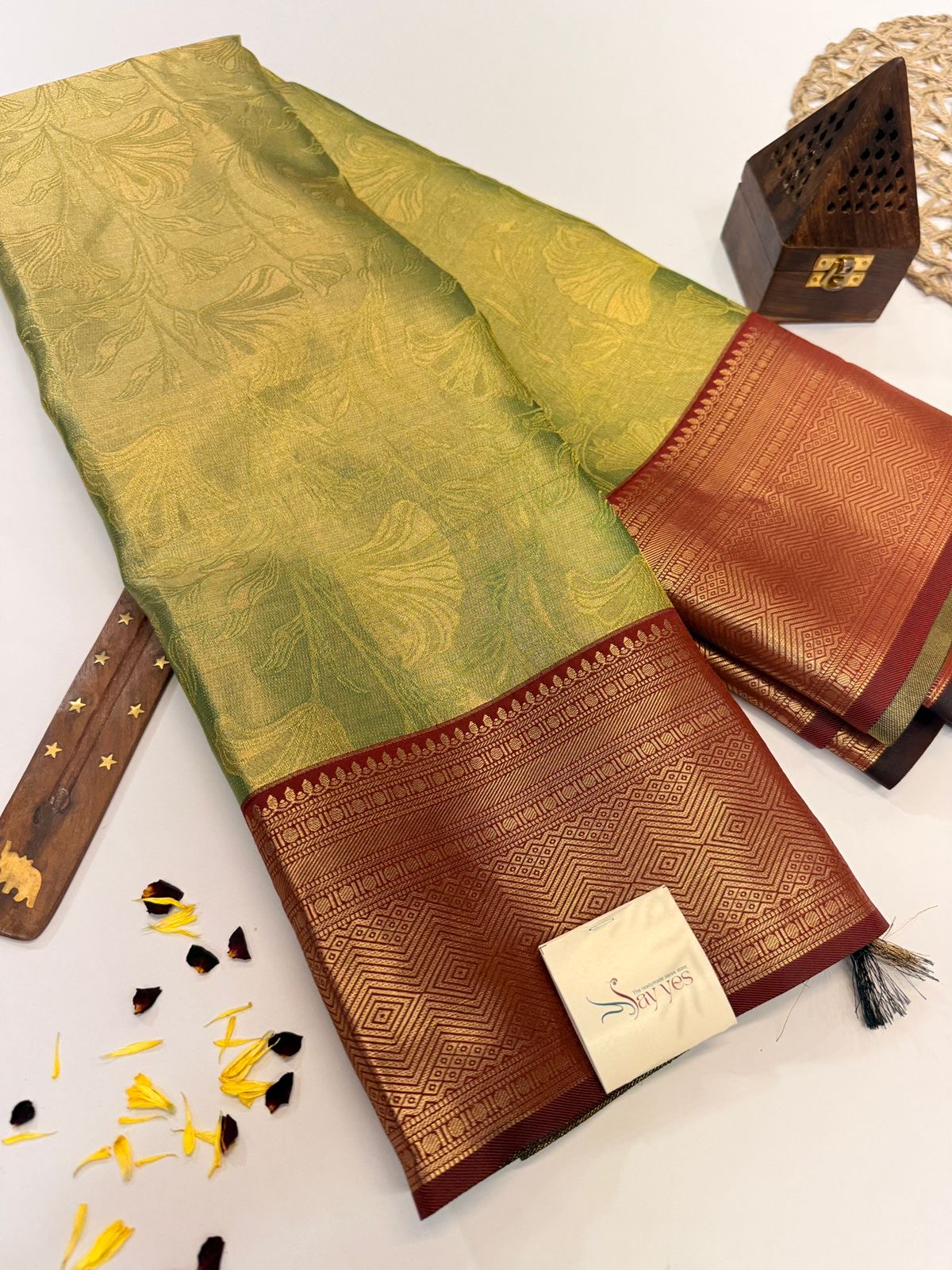 Unveil the radiance of tradition this festive season with our exclusive Diwali launch – a luxurious Kancheevaram tissue silk saree. Crafted in shimmering golden tissue silk, the saree glows with an ethereal brilliance, beautifully contrasted by the regal maroon border and pallu woven with intricate geometric zari motifs.