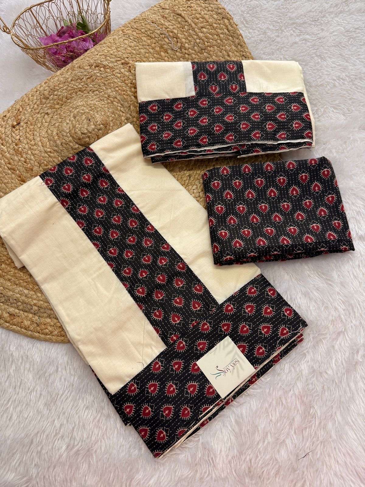 This is a handwoven cotton Set Mundu crafted in the traditional Kerala style, featuring a crisp white/off-white body paired with a vibrant Kalamkari-printed border. The mundu (dhoti) and veshti (upper drape) are made from breathable, lightweight cotton, ensuring all-day comfort and elegance. The Kalamkari border, adorned with intricate floral or mythological motifs in earthy tones, adds a distinctive artisanal touch, beautifully blending Kerala’s minimalism with Andhra’s artistic flair. Perfect for festivals, cultural gatherings, and casual ethnic wear.