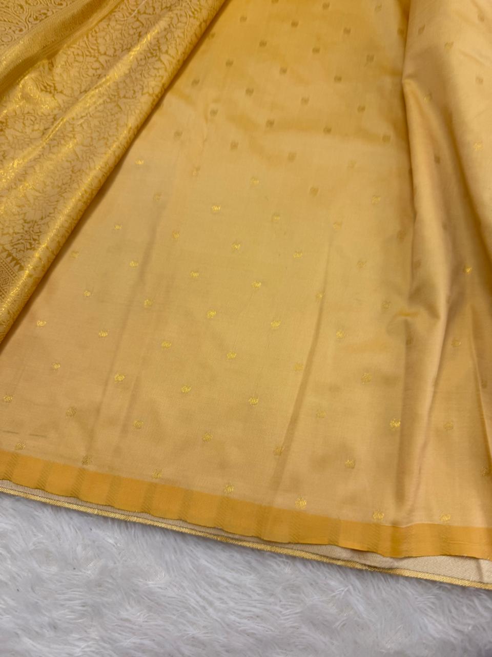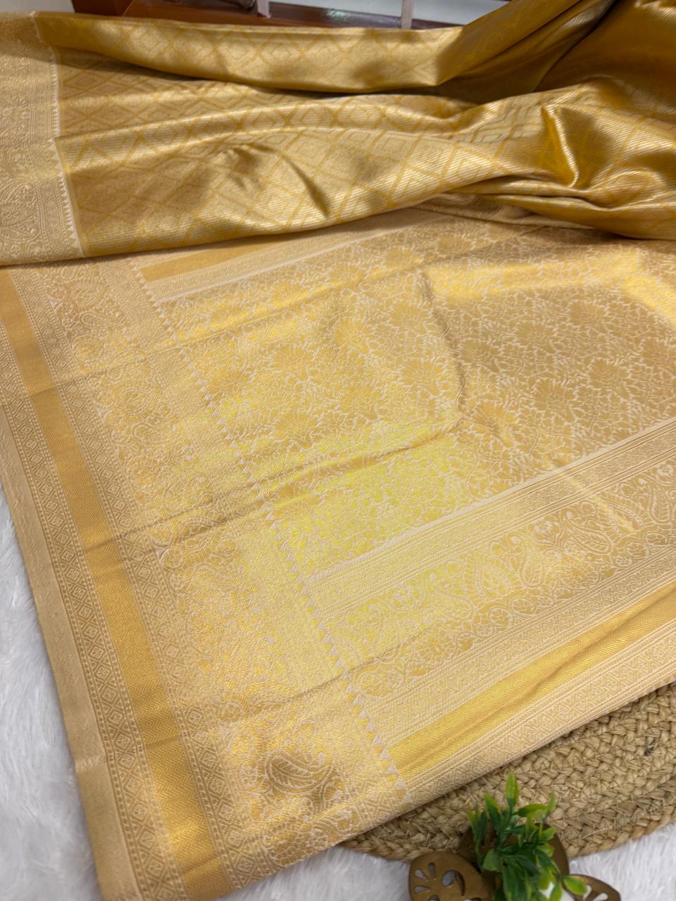 Our Banarasi soft silk sarees usher royal look with jari infused with saree thread all throughout the body and pallu . This edition, is so unique, as it has jari woven on the body of the saree, and the pallu.