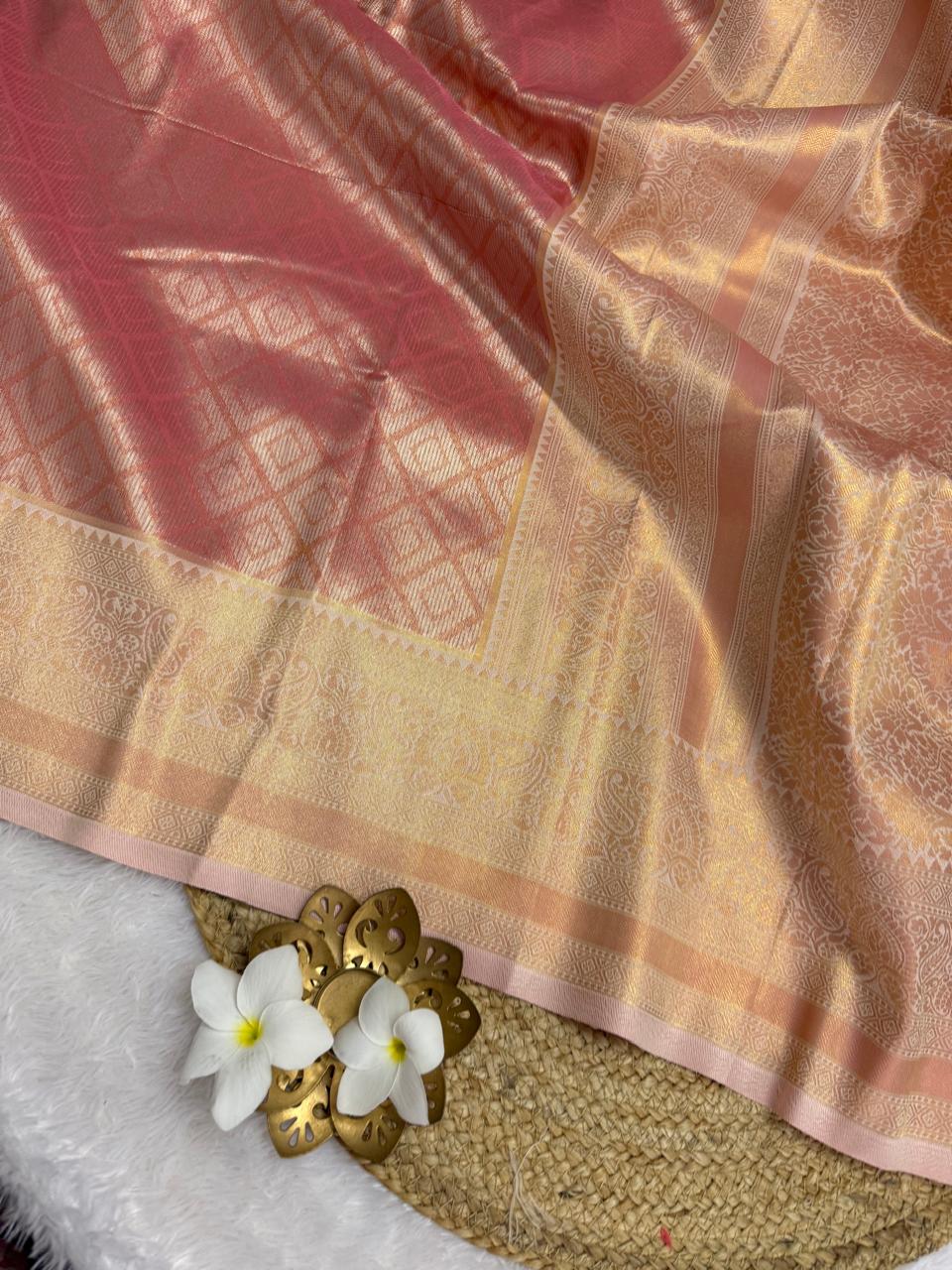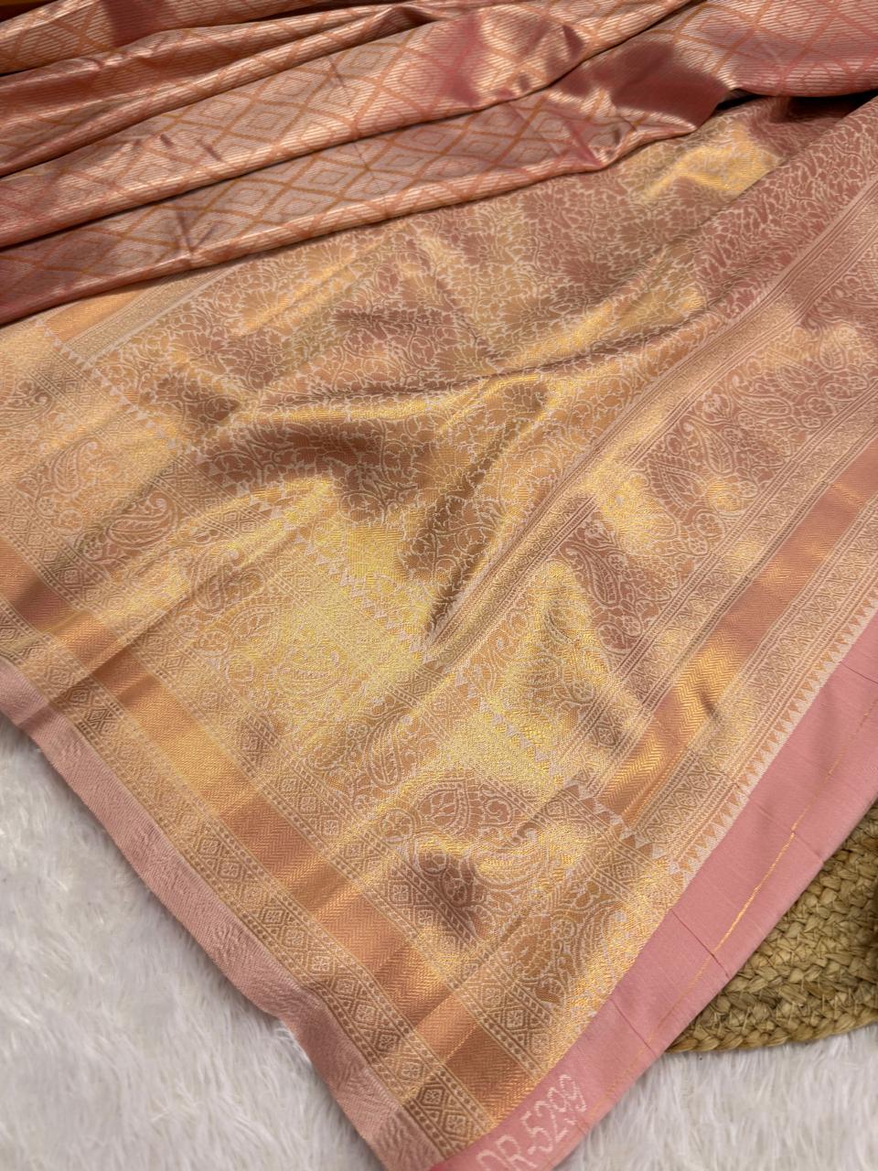 Our Banarasi soft silk sarees usher royal look with jari infused with saree thread all throughout the body and pallu . This edition, is so unique, as it has jari woven on the body of the saree, and the pallu.