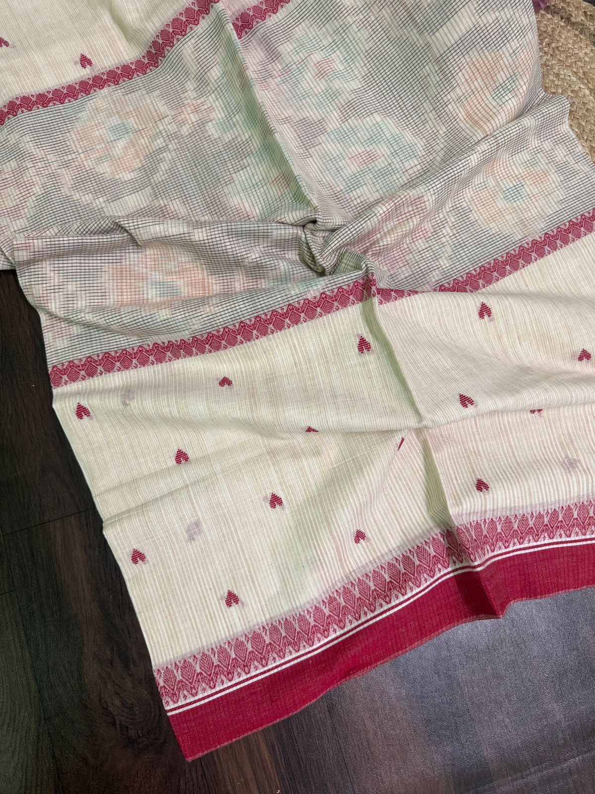This beautiful handwoven cotton saree features a soft cream base adorned with delicate maroon stripes. The saree has a classic appeal, with intricate maroon motifs and a finely designed pallu showcasing subtle floral patterns in pastel shades. The elegant maroon border enhances the overall sophistication of the saree, making it perfect for traditional events or casual wear.
