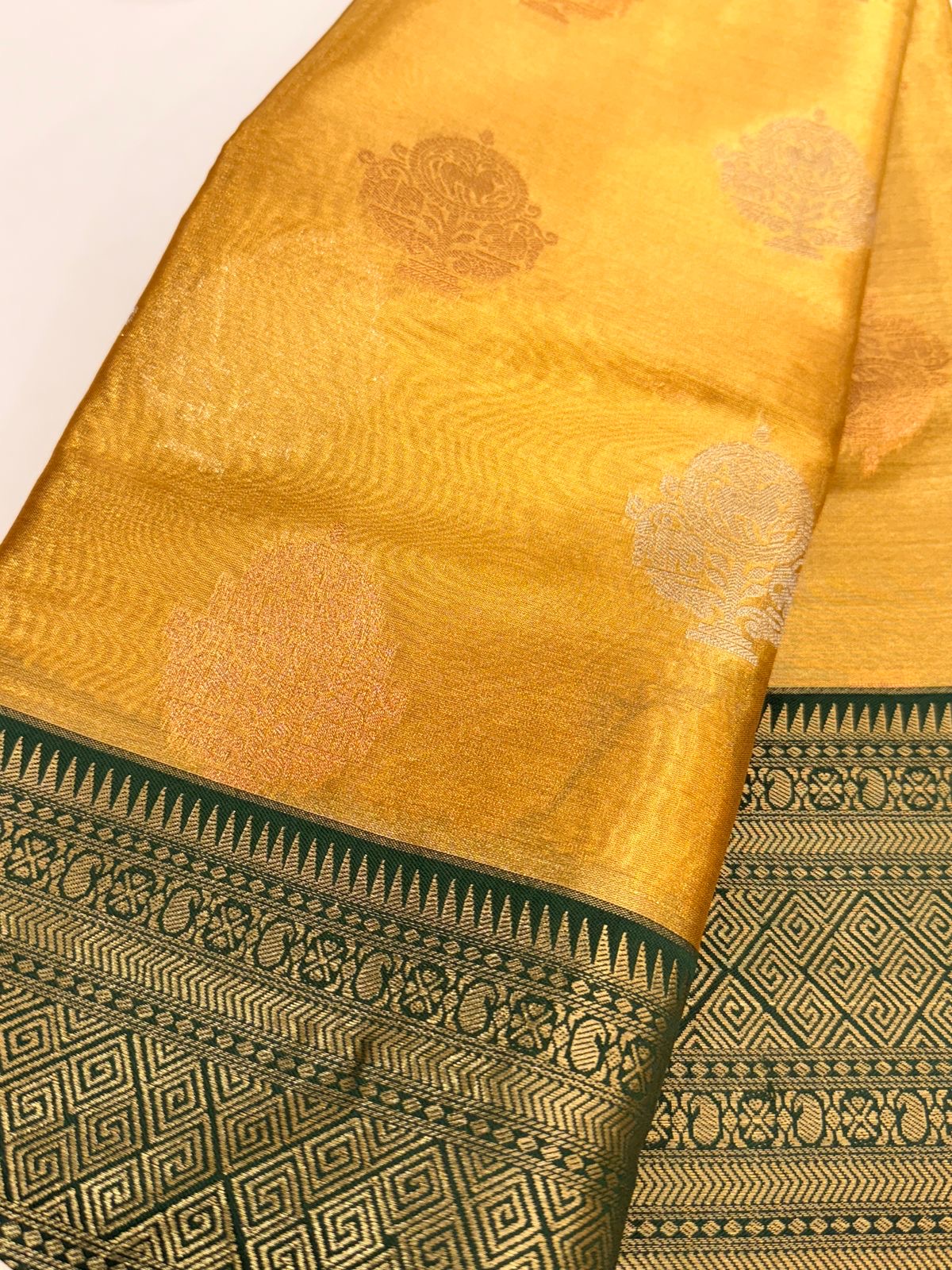 Dakshayini (Kancheevaram soft silk)- Mango yellow & Bottle green