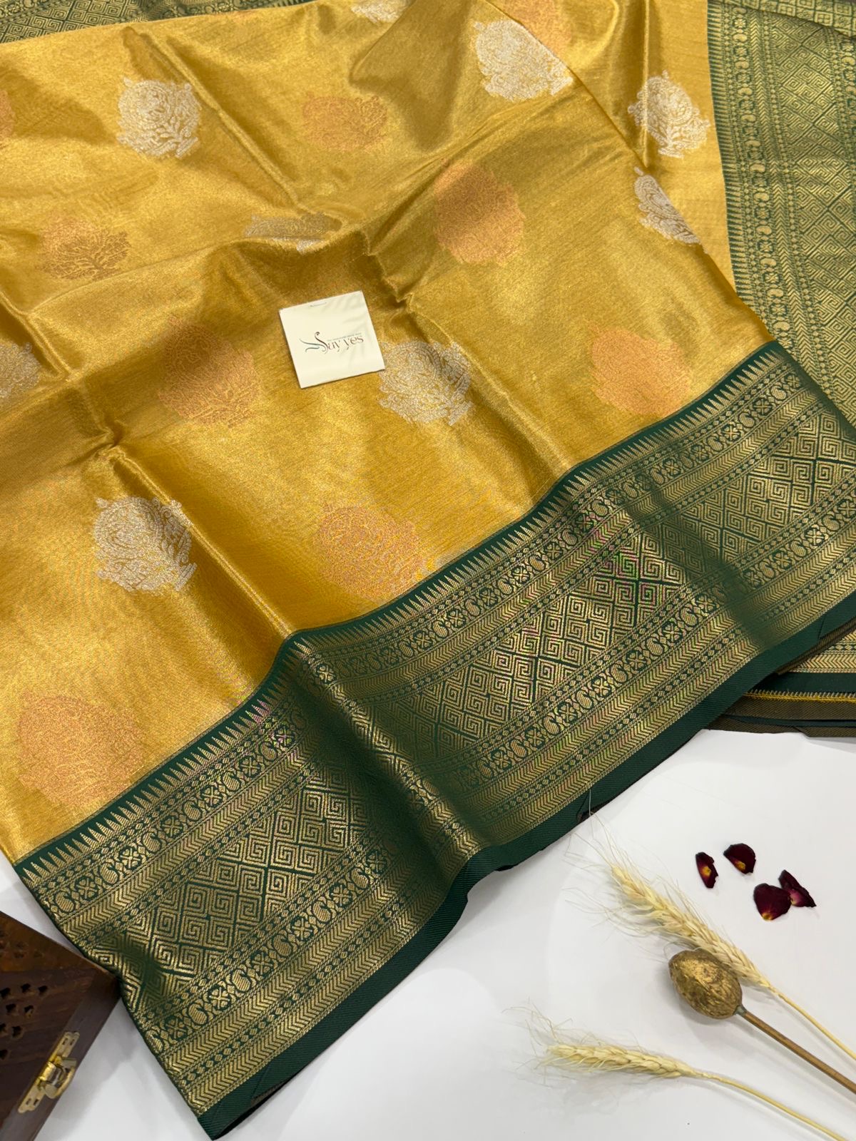 Drape yourself in timeless grandeur with Dakshayini – a radiant Kancheevaram tissue silk saree that glows in soft gold and coppery orange tones. Woven with intricate silver zari motifs of blooming floral vines and traditional checks, this saree is a blend of ethereal shimmer and regal tradition. The lightweight tissue silk makes it perfect for celebrations where grace meets comfort. A true heirloom piece that captures the warmth of tradition and the brilliance of celebration.