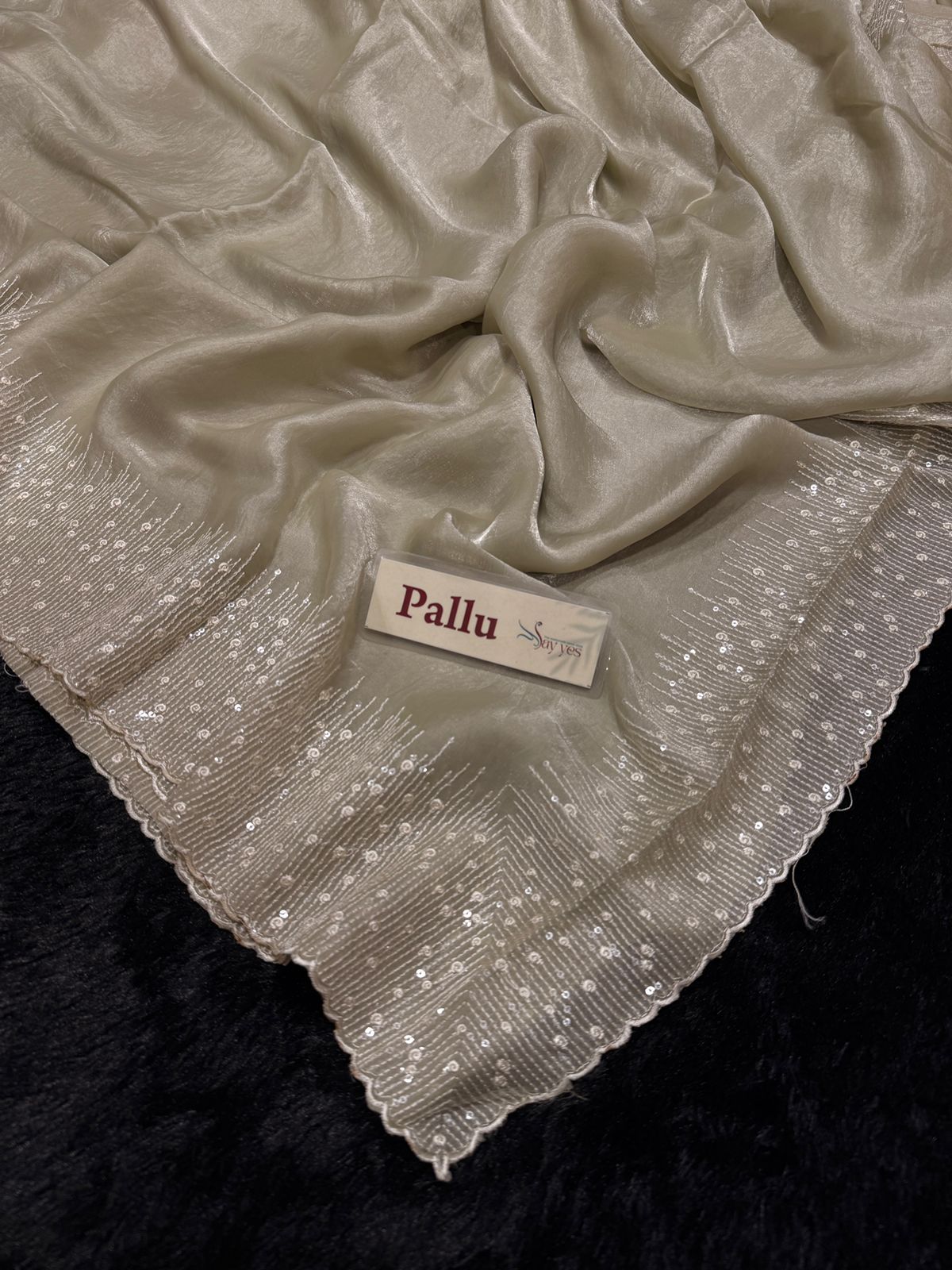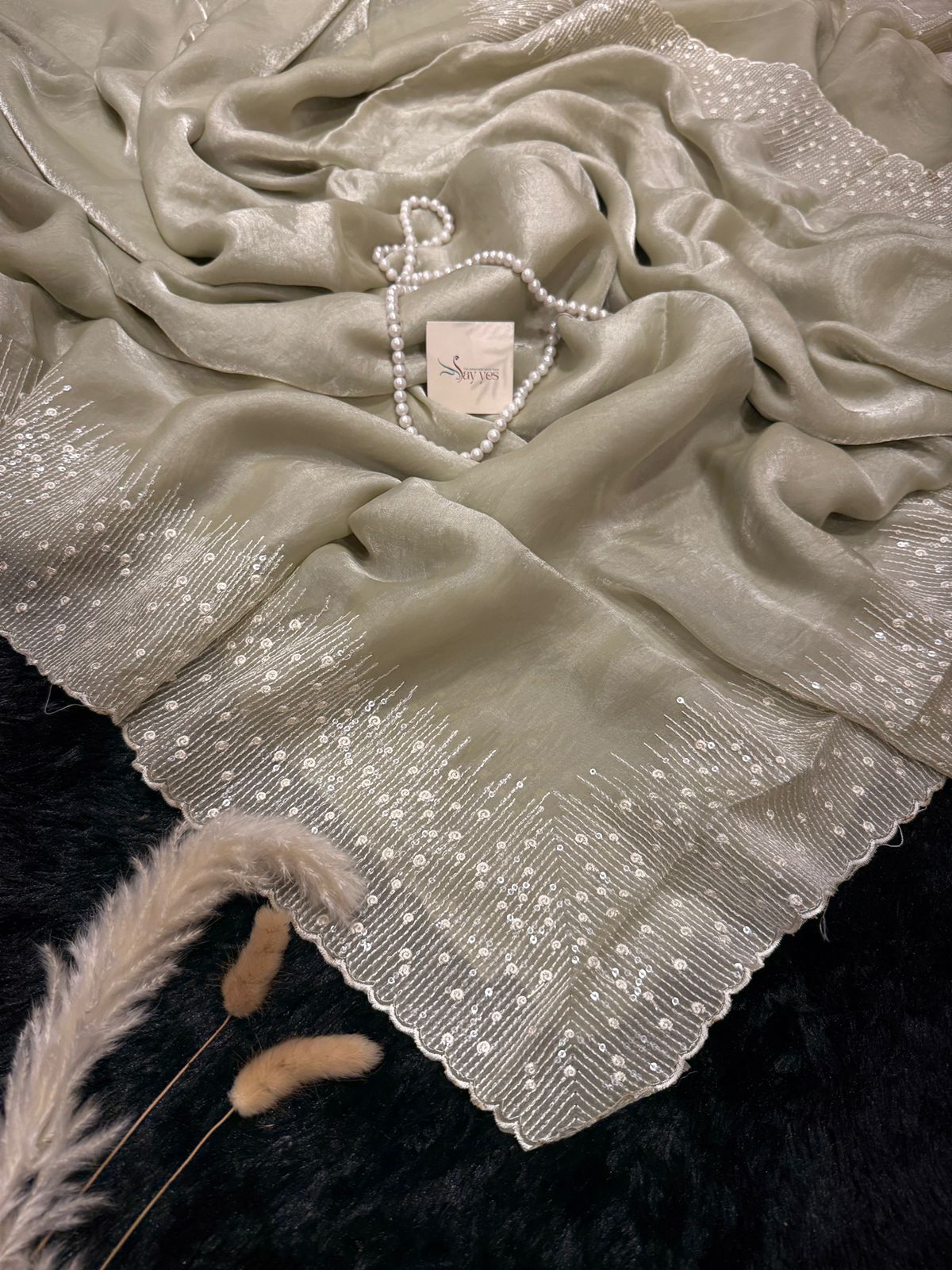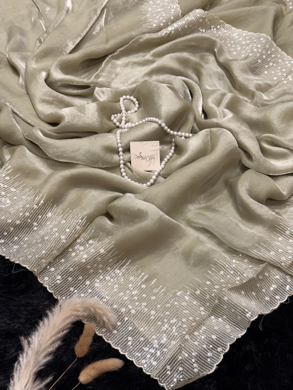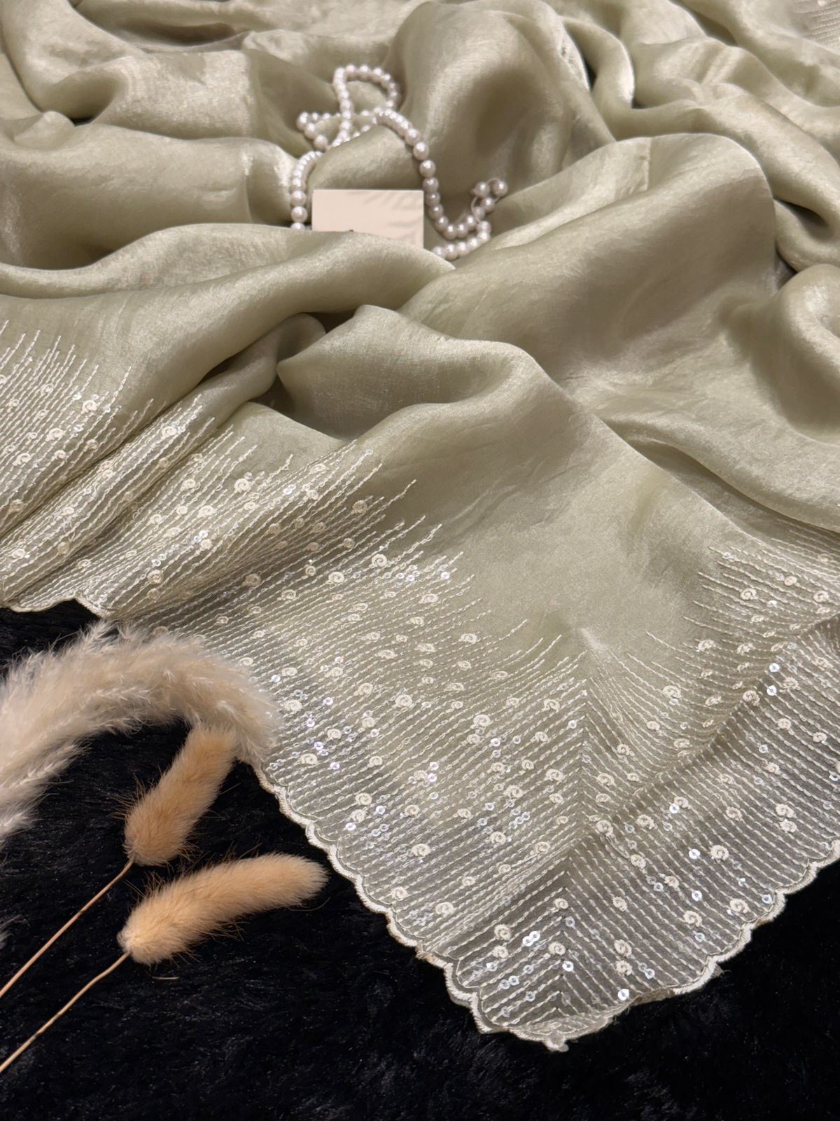 A soft mint pure Mosum glass organza saree adorned with delicate sequin detailing along the border. Light as air with a gentle sheen, it carries a calm elegance—perfect for days when you want to sparkle, subtly.