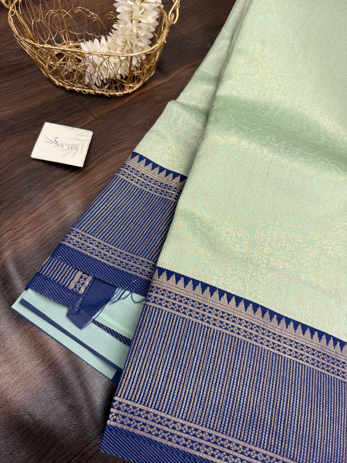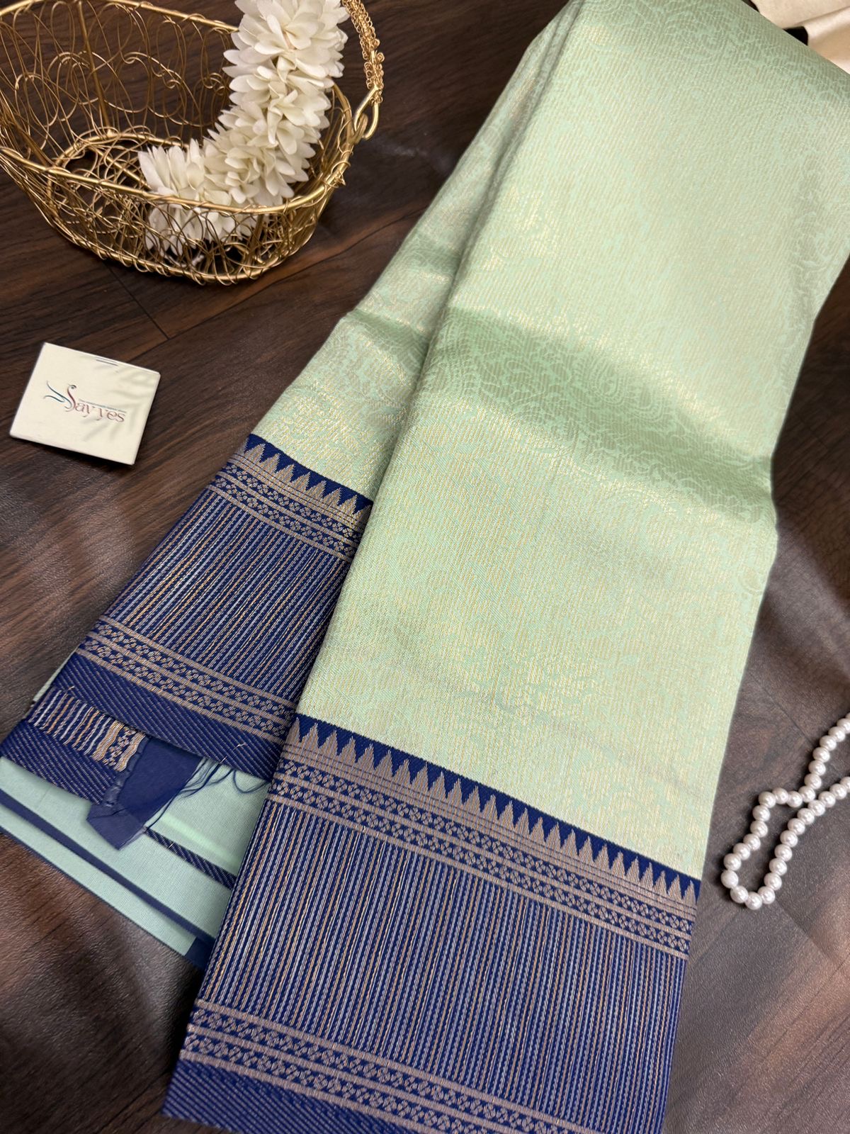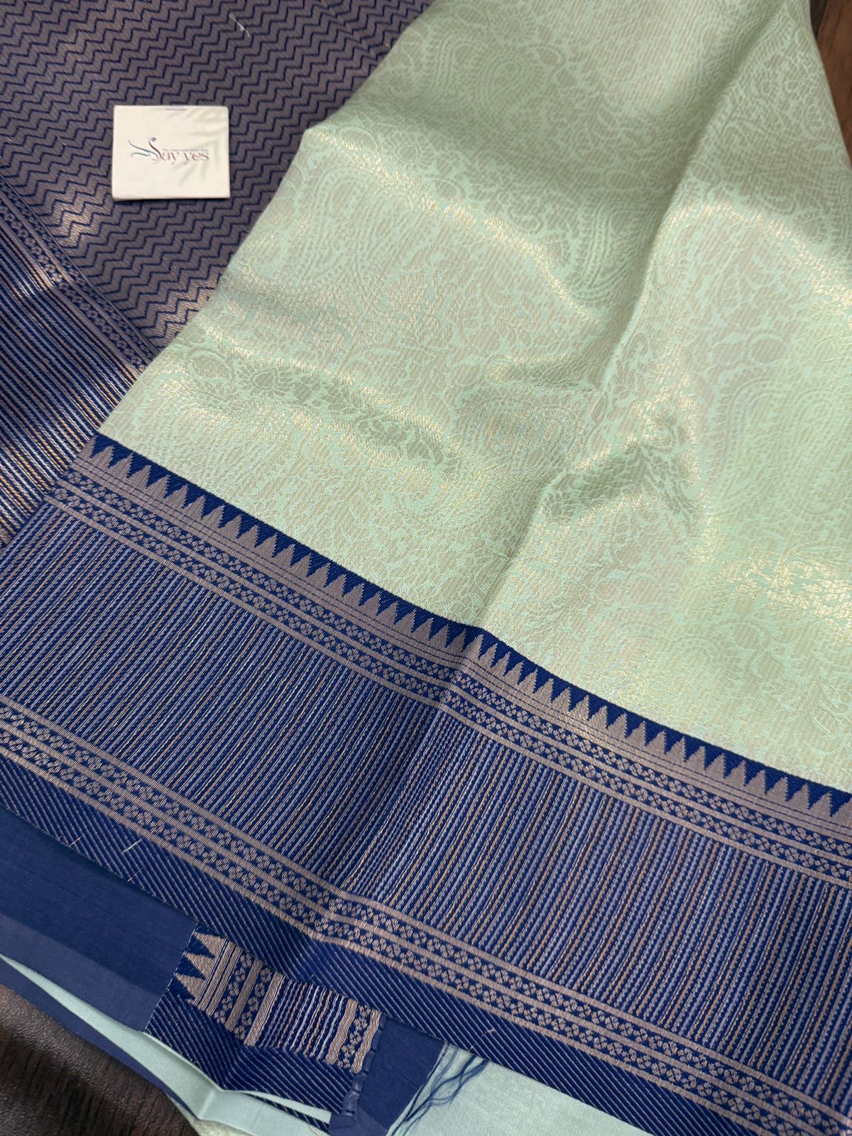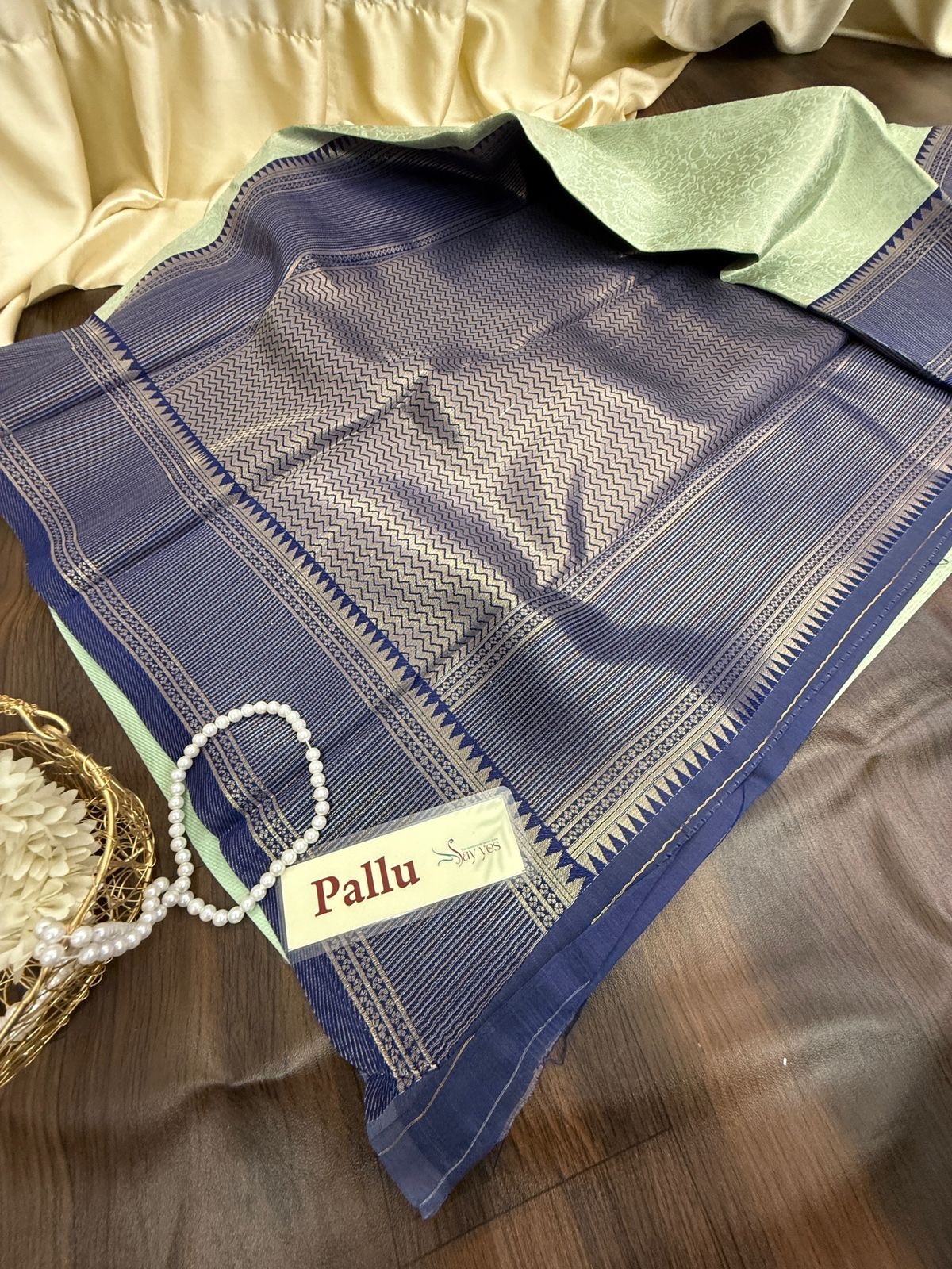 • Border: Teal blue-silver with temple and linework zari pattern