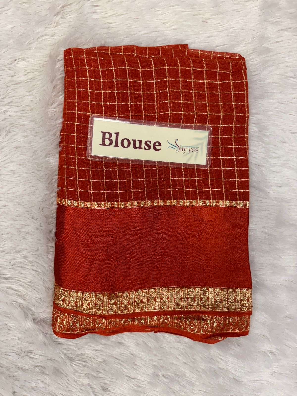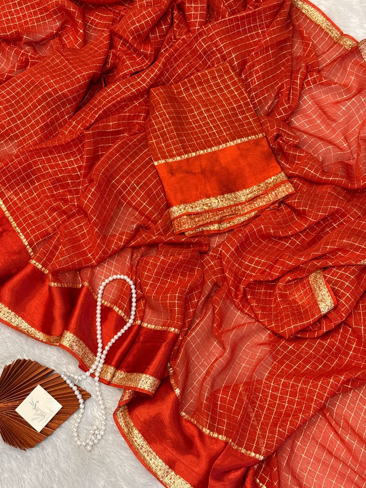 The Dilruba pure viscose georgette saree drapes like a dream, featuring a rich orange  base adorned with delicate golden checks and a luxurious zari-finished border. Lightweight, flowy, and effortlessly elegant—perfect for evenings that deserve a little extra glow.