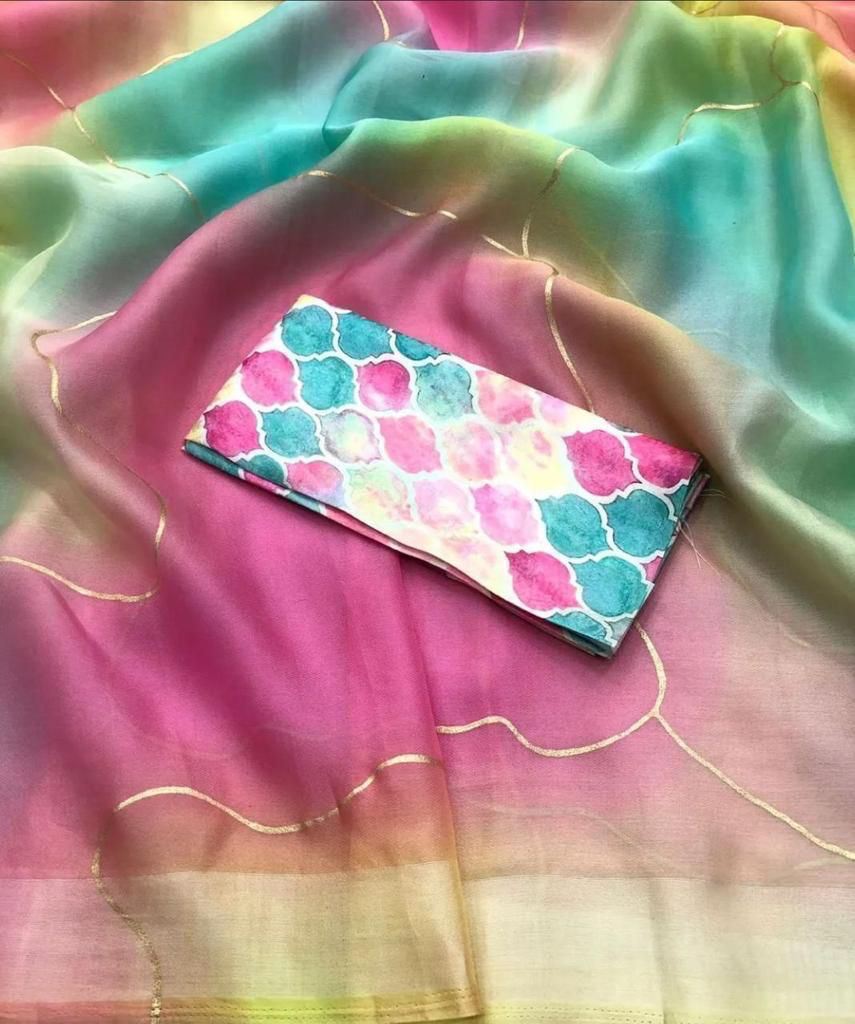 Soft Organza dreamy pastel shaded print with foil outline allover saree with beautiful fancy tassels