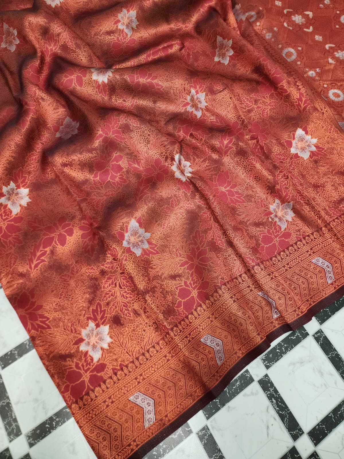 We have ingeniously chosen this piece of soft silk which is a perfect confluence of zari woven florals on the body with sparkle emboss and a rich pallu all in the same tone to elegantly suit every Indian Occasion. Perfect to wear for Weddings and auspicious days.
