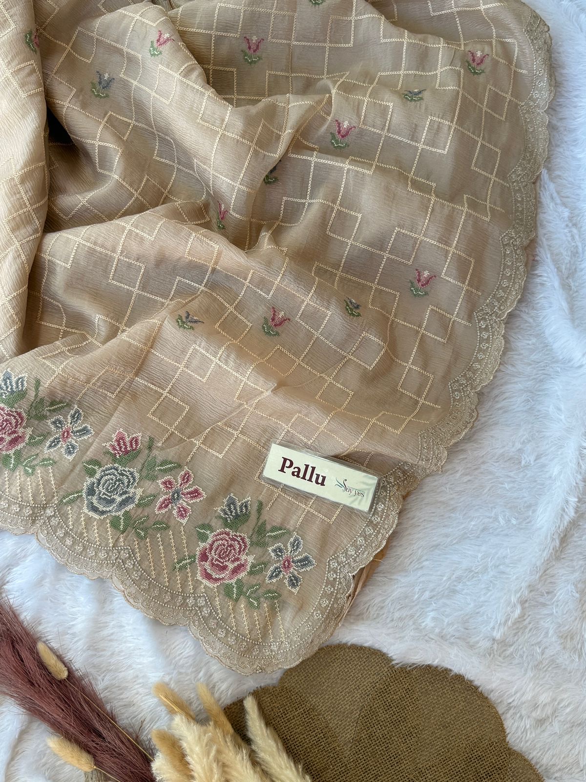 The subtle crushed texture gives it a naturally graceful fall, while the grid pattern and pastel blooms lend a modern vintage feel. Perfect for brunches, festive evenings, or intimate celebrations where you want to look ethereal yet at ease.