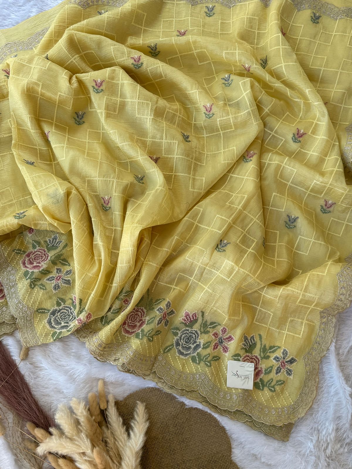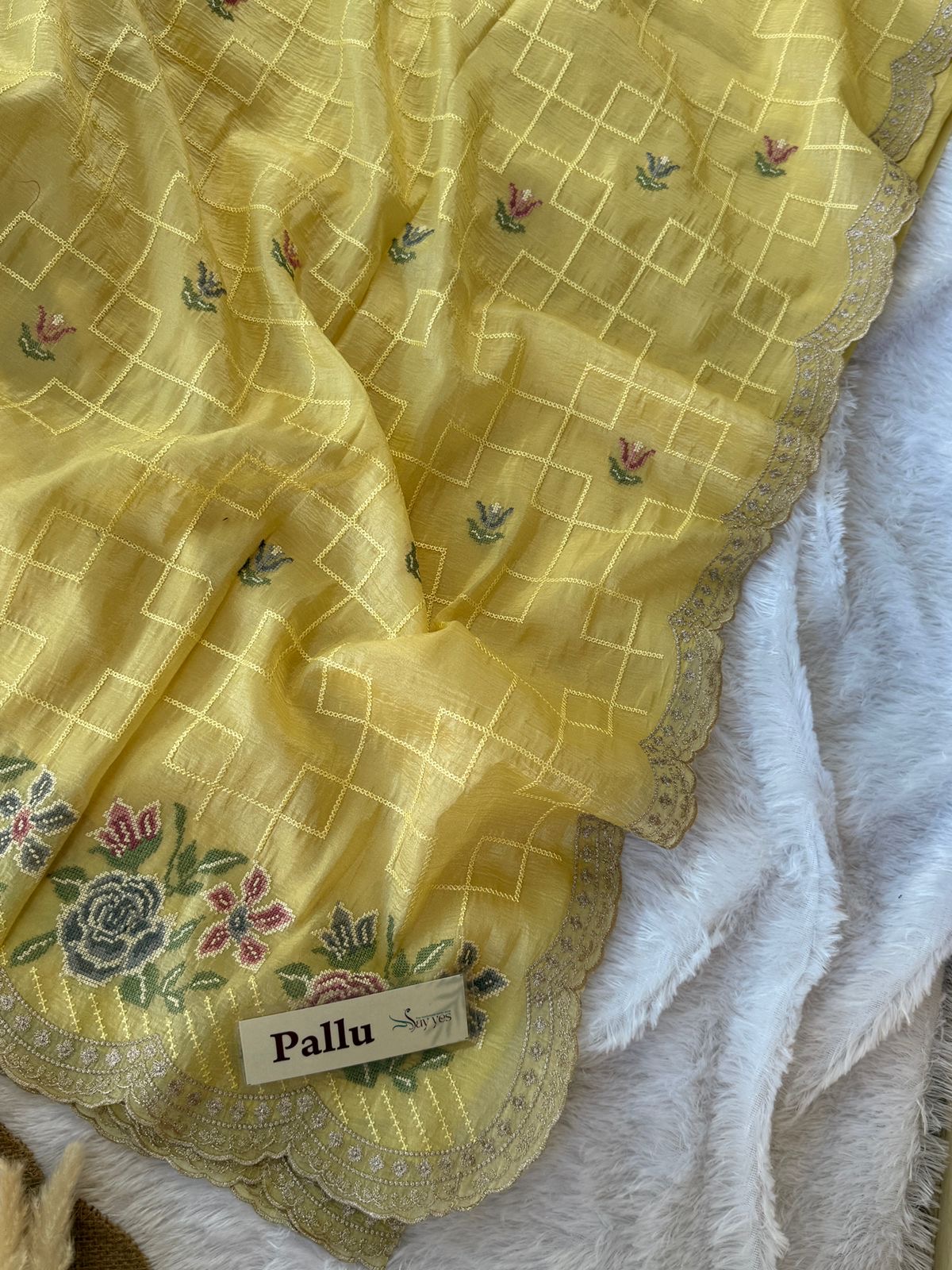 Whisper-light and effortlessly elegant — this lavender crushed chiffon saree is a celebration of femininity and charm. Adorned with delicate floral embroidery and scalloped lace borders, it drapes like poetry, adding a soft romantic glow to your look.