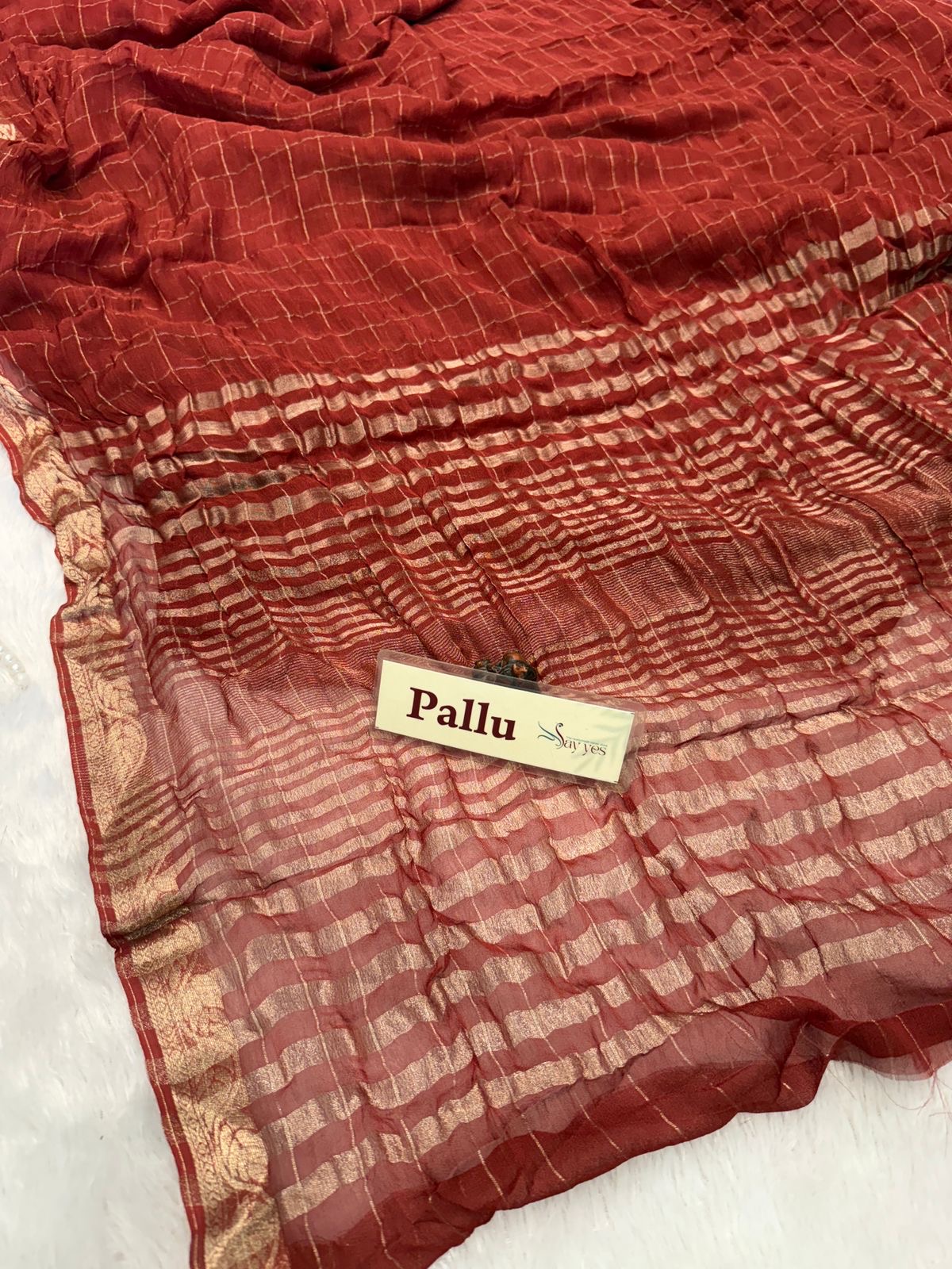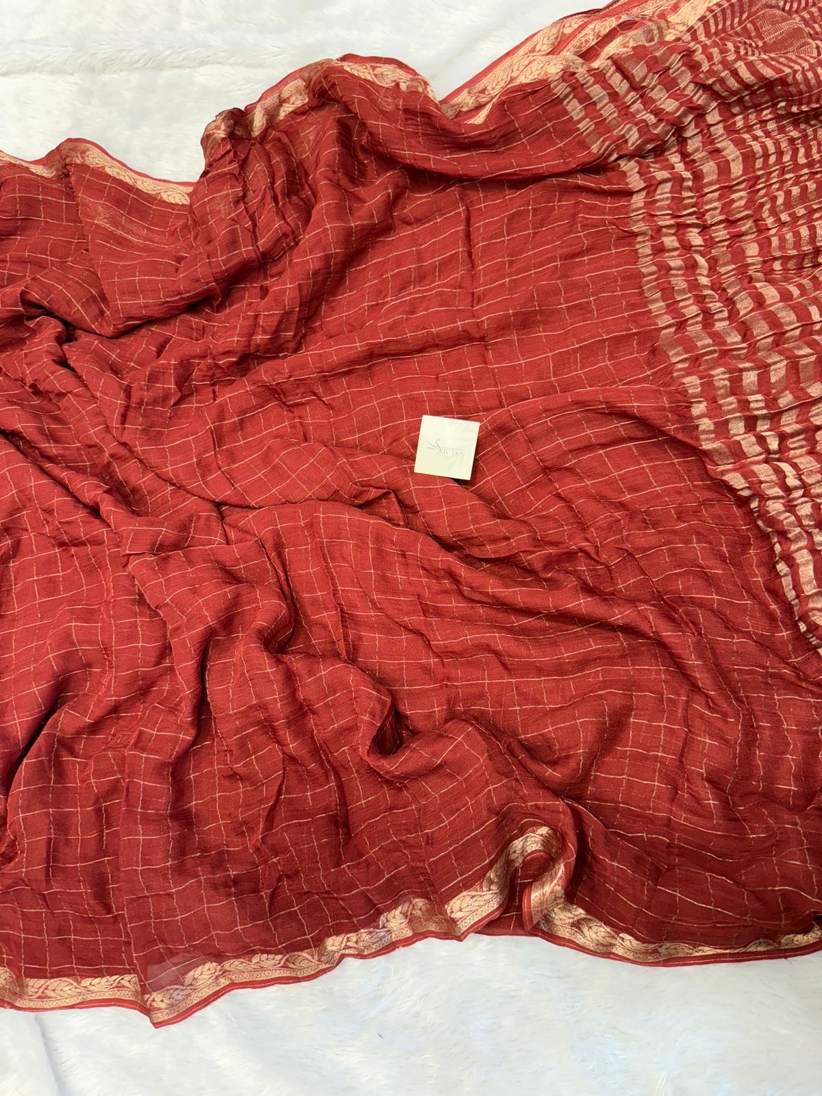 Light as air and beautifully fluid, this viscose georgette saree is designed to move with you. Drenched in a rich rust-broen hue with subtle gold checks and a softly textured pallu, it strikes the perfect balance between elegance and ease. The fabric falls smoothly without clinging, creating a naturally flattering silhouette that feels as good as it looks.