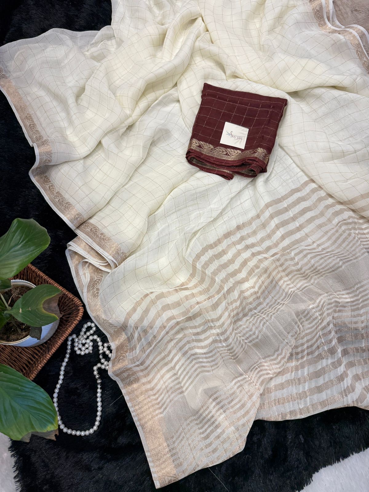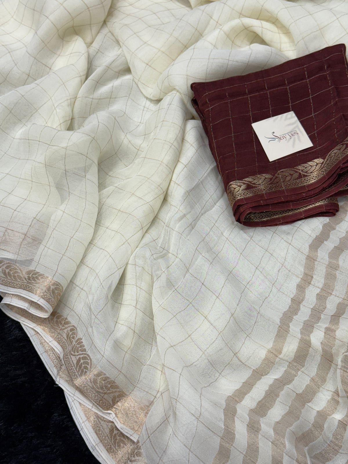 Light as air and beautifully fluid, this viscose georgette saree is designed to move with you. Drenched in a rich rust-broen hue with subtle gold checks and a softly textured pallu, it strikes the perfect balance between elegance and ease. The fabric falls smoothly without clinging, creating a naturally flattering silhouette that feels as good as it looks.