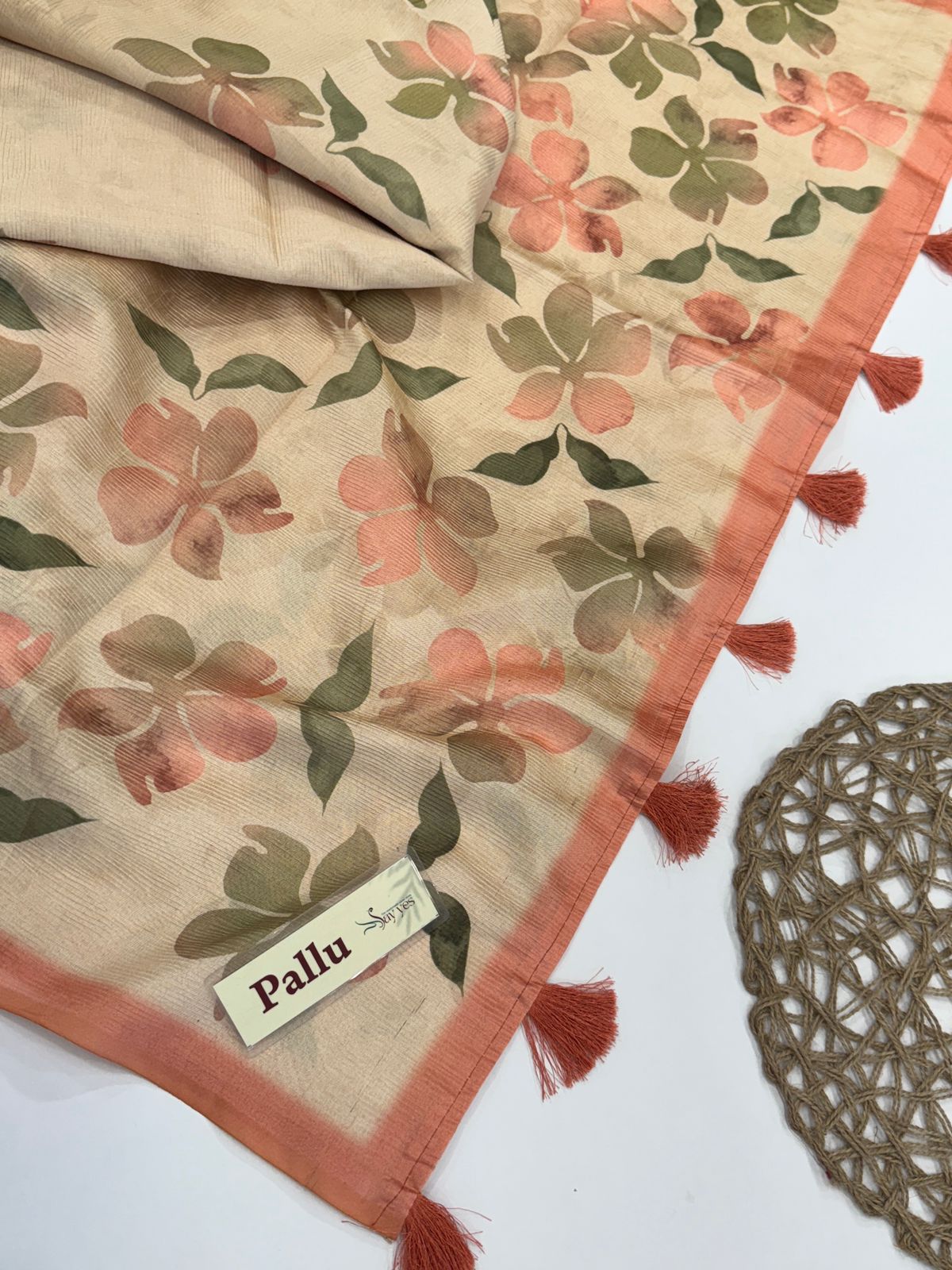 Finished with a solid pastel orange border that frames the saree beautifully.