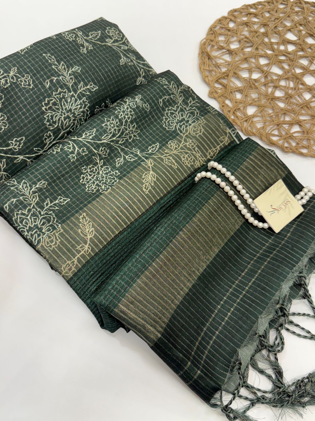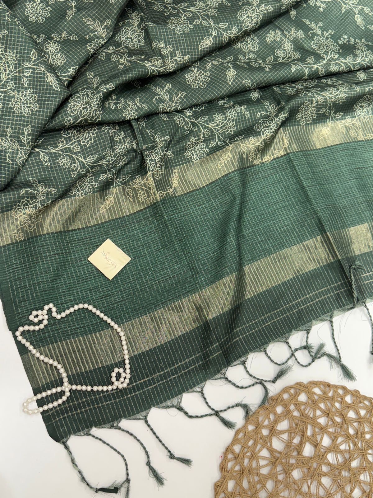 This elegant Tussar silk saree is a celebration of quiet luxury and refined craftsmanship. Set in a deep, muted green-grey base, the saree is adorned with delicate, hand-inspired floral motifs that flow organically across the body, creating a soft, artistic movement.